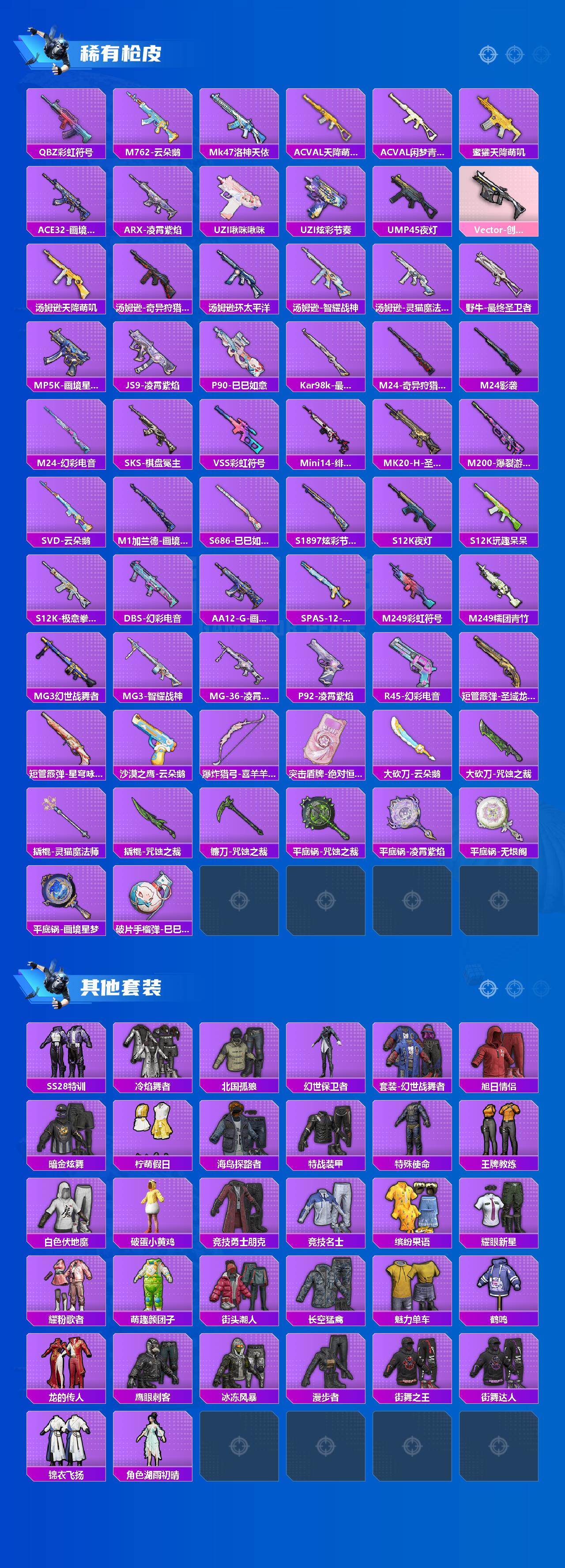 - [17180891]【店主推荐捡漏号!可直接换绑】46180k哈伏币-201m流动资产-60烽火等级-钻石-27战场等级-上等兵 【干员外观】:蜂医-送葬人·无题密令,深蓝-不破誓约,红狼-电锯惊魂 【近战皮肤】:近战-信条,近战-黑鹰 【传说外观】:M4A1突击步枪-蚀金玫瑰,M4A1突击步枪-阿米娅,ASh-12战斗步枪-鹅鸭杀,SG552突击步枪-运动员,AK-12突击步枪-特斯拉线圈,SCAR-H战斗步枪-启航,G3战斗步枪-骑士,CAR-15突击步枪-阿米娅,腾龙突击步枪-捞点薯条,KC17突击步枪-电锯惊魂,P90冲锋枪-信条,UZI冲锋枪-特斯拉线圈,SR-3M紧凑突击步枪-特斯拉线圈,勇士冲锋枪-能天使-午夜邮差,QCQ171冲锋枪-鹅鸭杀,725双管霰弹枪-送葬人-无题密令,M250通用机枪-骑士之心,QJB201轻机枪-鹅鸭杀,SR-25射手步枪-信条,R93狙击步枪-维什戴尔,AWM狙击步枪-捞点薯条,93R-捞点薯条,复合弓-黑·天际线 【史诗外观】:ASh-12战斗步枪-无极限,M16A4突击步枪-竞赛选手,AUG突击步枪-蝮蛇,G3战斗步枪-流沙送葬,AS Val突击步枪-典狱官,AS Val突击步枪-百步穿杨,腾龙突击步枪-无垢,腾龙突击步枪-猎鳄行动,K437突击步枪-守护者,MP5冲锋枪-深海恐惧,MP5冲锋枪-战术竞备,MP5冲锋枪-竞技风,Vector冲锋枪-阿萨拉文明,Vector冲锋枪-异域战争,SR-3M紧凑突击步枪-荒野求生,SR-3M紧凑突击步枪-战术竞备,勇士冲锋枪-工业狂潮,MP7冲锋枪-无垢,MP7冲锋枪-守护者,PKM通用机枪-荒野求生,M250通用机枪-囚徒,Mini-14射手步枪-守护者,SVD狙击步枪-荒野求生,PSG-1射手步枪-无垢,SV-98狙击步枪-林中猎手,SV-98狙击步枪-囚徒,M700狙击步枪-竞技风,M700狙击步枪-蝮蛇,M700狙击步枪-百步穿杨,AWM狙击步枪-无极限,复合弓-守护者 【稀有外观】:M4A1突击步枪-零点,M4A1突击步枪-繁盛,AKM突击步枪-战术演练,AKM突击步枪-肃杀,QBZ95-1突击步枪-公平竞技,ASh-12战斗步枪-繁盛,K416突击步枪-碳纤维,K416突击步枪-虎啸,M16A4突击步枪-街头涂鸦,M7战斗步枪-捣蛋鬼,AK-12突击步枪-零点,SCAR-H战斗步枪