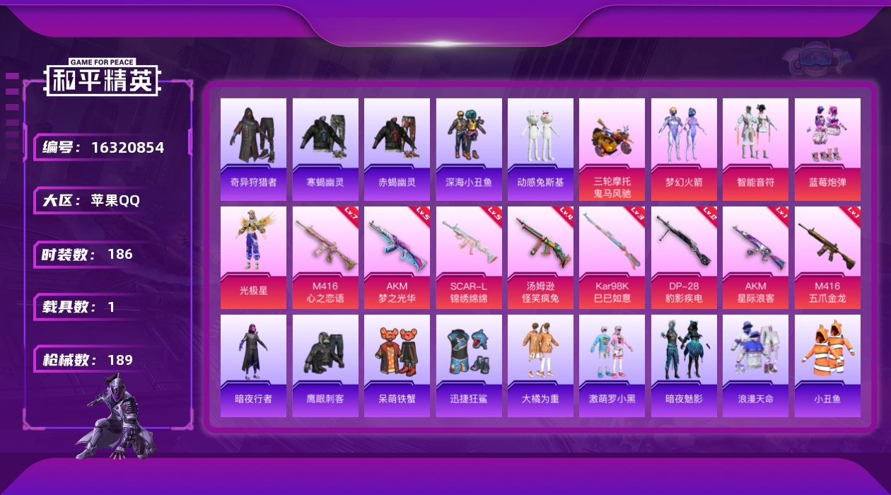 [16320854]苹果 手Q-4粉装-8特效枪-1载具-1粉色飞行器-63023热力值-8王牌印记-186套装-189枪皮