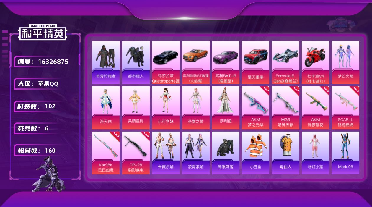[16326875]【特价出售/店主推荐】苹果 手Q-6粉装-6特效枪-7载具-3粉色飞行器-56383热力值-9王牌印记-102套装-160枪皮【热门品类】:粉装-梦幻火箭,套装-都市猎人,套装-小丑鱼,套装-奇异狩猎者,套装-龟仙人,套装-粉红小猪,角色-Mark.06【粉色套装】:粉装-梦幻火箭,角色-洛天依,角色-呆萌星弥,角色-小可学妹,角色-圣堂之誓,角色-萨利娅【粉色枪皮等级】:AKM-梦之光华(七级),AKM-绿萝繁花(五级),SCAR-L-锦绣绵绵(五级),Kar98K-巳巳如意(五级),DP-28-豹影疾电(三级),MG3-洛神天依(七级)【粉色载具】:玛莎拉蒂Quattroporte(夜幕蓝),宾利欧陆GT敞篷(火焰橘),宾利BATUR(极速紫),擎天重拳,Formula E Gen2(巅峰兰),杜卡迪 Panigale V4(杜卡迪红),僚机-萌酷奶龙【粉色枪皮】:AKM-梦之光华,AKM-绿萝繁花,SCAR-L-锦绣绵绵,Kar98K-巳巳如意,DP-28-豹影疾电,MG3-洛神天依【粉色飞行器】:梦幻火箭飞行器,祥瑞锦鲤飞行器,暮色之舞飞行器