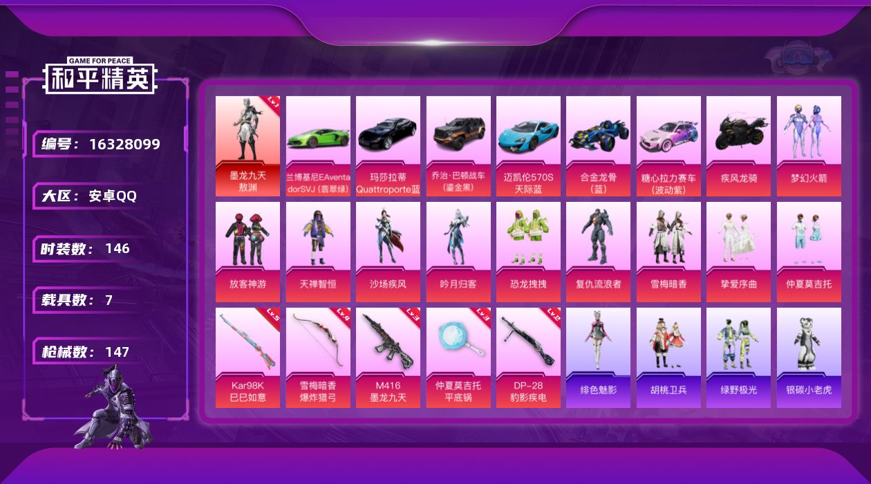 [16328099]【特价出售/店主推荐】安卓 手Q-1神装-10粉装-5特效枪-7载具-3粉色飞行器-55705热力值-11王牌印记-146套装-147枪皮【红色神装等级】:墨龙九天-敖渊(一级)【红色角色神装】:墨龙九天-敖渊【热门品类】:粉装-梦幻火箭,角色-军刀雅典娜,套装-龟仙人【粉色套装】:粉装-梦幻火箭,粉装-放客神游,粉装-天禅智恒,粉装-沙场疾风,粉装-吟月归客,粉装-恐龙拽拽,角色-复仇流浪者,粉装-雪梅暗香,粉装-挚爱序曲,粉装-仲夏莫吉托【粉色枪皮等级】:M416-墨龙九天(三级),Kar98K-巳巳如意(五级),DP-28-豹影疾电(二级),爆炸猎弓-雪梅暗香(四级),平底锅-仲夏莫吉托(三级)【粉色载具】:兰博基尼Aventador SVJ(翡翠绿),玛莎拉蒂Quattroporte(夜幕蓝),乔治巴顿战车(鎏金黑),迈凯伦570S(天际蓝),合金龙骨(蓝),糖心拉力赛车(波动紫),疾风龙骑【粉色枪皮】:M416-墨龙九天,Kar98K-巳巳如意,DP-28-豹影疾电,爆炸猎弓-雪梅暗香,平底锅-仲夏莫吉托【粉色飞行器】:雪梅暗香飞行器,龙翔九天飞行器