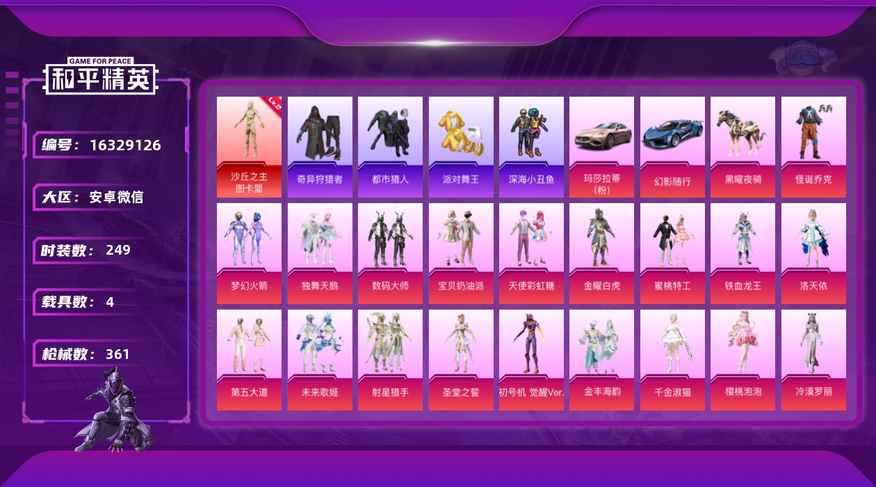 [16329126]地铁满天赋!极品男神素材号!【特价出售/店主推荐】安卓 微信-1神装-20粉装-19特效枪-4载具-11粉色飞行器-135716热力值-21王牌印记-249套装-361枪皮【红色神装等级】:沙丘之主-图卡盟(二级)【红色角色神装】:沙丘之主-图卡盟【热门品类】:粉装-怪诞乔克,粉装-梦幻火箭,套装-浪漫天命,套装-都市猎人,套装-派对舞王,套装-深海小丑鱼,套装-小丑鱼,套装-奇异狩猎者,角色-军刀雅典娜,套装-龟仙人,套装-暗影哥特,角色-8号机,角色-Mark.06【粉色套装】:粉装-独舞天鹅,粉装-数码大师,粉装-怪诞乔克,粉装-宝贝奶油派,粉装-天使彩虹糖,粉装-金曜白虎,粉装-梦幻火箭,粉装-蜜桃特工,粉装-铁血龙王,角色-洛天依,粉装-第五大道,粉装-未来歌姬,粉装-射星猎手,角色-圣堂之誓,角色-初号机 觉醒Ver.,粉装-金丰海韵,角色-千金淑猫,角色-樱桃泡泡,角色-冷漠罗丽,角色-罗征【粉色枪皮等级】:AKM-甜心宝贝(七级),AKM-星际浪客(一级),SCAR-L-机甲封神(五级),M416-心之恋语(一级),M416-至情至圣(九级),M416-墨龙九天(一级),GROZA-香水柠檬(五级),AUG-超新星(五级),ARX-无垠阁(六级),Vector-环太平洋(五级),AKS-74U-星穹咏叹调(五级),P90-能量风暴(四级),P90-沙丘之主(六级),Kar98K-巳巳如意(五级),Mk14-甜梦熊击(五级),M417-第五大道(四级),DP-28-豹影疾电(五级),MG3-梦幻舞会(五级),破片手榴弹-热量炸弹(七级)【粉色载具】:玛莎拉蒂Ghibli(粉),幻影随行,黑曜夜骑【粉色枪皮】:AKM-甜心宝贝,AKM-星际浪客,SCAR-L-机甲封神,M416-心之恋语,M416-至情至圣,M416-墨龙九天,GROZA-香水柠檬,AUG-超新星,ARX-无垠阁,Vector-环太平洋,AKS-74U-星穹咏叹调,P90-能量风暴,P90-沙丘之主,Kar98K-巳巳如意,Mk14-甜梦熊击,M417-第五大道,DP-28-豹影疾电,MG3-梦幻舞会,破片手榴弹-热量炸弹【粉色飞行器】:酣梦熊熊飞行器,梦幻火箭飞行器,星际浪客飞行器,沙丘之主天马,镜域双华-灵镜之阶,龙翔九天飞行器,深渊漩涡飞行器,雀灵庇佑飞行器,灵猫魔法师飞行器