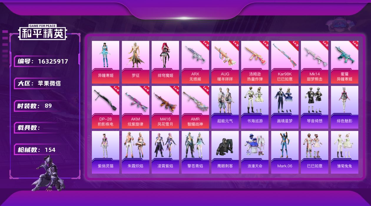 [16325917]【特价出售/店主推荐】苹果 微信-3粉装-10特效枪-0载具-3粉色飞行器-43137热力值-6王牌印记-89套装-154枪皮【热门品类】:套装-浪漫天命,角色-Mark.06【粉色套装】:角色-罗征,角色-绯穹魔姬,角色-异瞳寒姬【粉色枪皮等级】:AKM-炫紫旋律(四级),M416-风花雪月(四级),AUG-暖羊咩咩(五级),蜜獾-异瞳寒姬(四级),ARX-无垠阁(五级),汤姆逊-热量炸弹(五级),Kar98K-巳巳如意(五级),Mk14-甜梦熊击(五级),AMR-智耀战神(四级),DP-28-豹影疾电(四级)【粉色枪皮】:AKM-炫紫旋律,M416-风花雪月,AUG-暖羊咩咩,蜜獾-异瞳寒姬,ARX-无垠阁,汤姆逊-热量炸弹,Kar98K-巳巳如意,Mk14-甜梦熊击,AMR-智耀战神,DP-28-豹影疾电【粉色飞行器】:歌者泠鸢飞行器,无垠阁飞行器