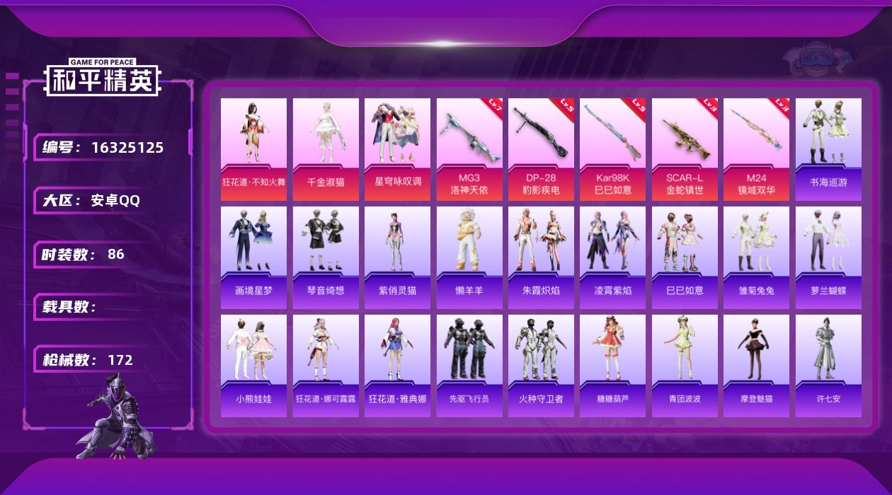[16325125]【特价出售/店主推荐】安卓 手Q-4粉装-6特效枪-0载具-4粉色飞行器-47525热力值-3王牌印记-86套装-172枪皮【粉色套装】:角色-狂花道·不知火舞,角色-千金淑猫,粉装-星穹咏叹调,角色-罪夜之冕【粉色枪皮等级】:SCAR-L-金蛇镇世(三级),AKS-74U-森灵之息(五级),Kar98K-巳巳如意(五级),M24-镜域双华(三级),DP-28-豹影疾电(五级),MG3-洛神天依(七级)【粉色枪皮】:SCAR-L-金蛇镇世,AKS-74U-森灵之息,Kar98K-巳巳如意,M24-镜域双华,DP-28-豹影疾电,MG3-洛神天依【粉色飞行器】:曦光华影飞行器,脆鲨七海飞行器,凤舞九天飞行器,万象金身飞行器