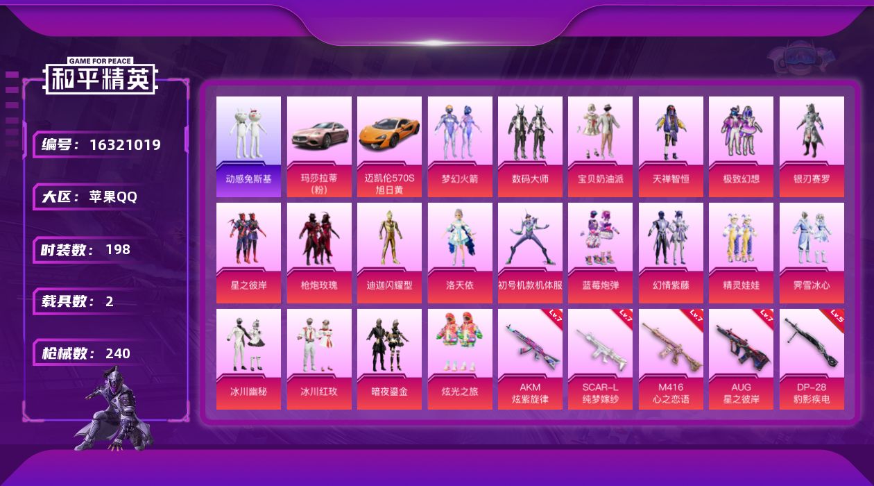 [16321019]苹果 手Q-19粉装-6特效枪-2载具-2粉色飞行器-86307热力值-17王牌印记-198套装-240枪皮