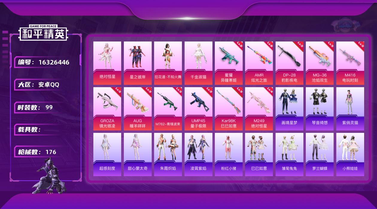 [16326446]【特价出售/店主推荐】安卓 手Q-4粉装-11特效枪-0载具-1粉色飞行器-51421热力值-7王牌印记-99套装-176枪皮【热门品类】:套装-粉红小猪【粉色套装】:角色-绝对恒星,粉装-星之彼岸,角色-狂花道·不知火舞,角色-千金淑猫【粉色枪皮等级】:M416-电玩时刻(五级),GROZA-镜光银凌(五级),AUG-暖羊咩咩(五级),M762-青锋波束(五级),蜜獾-异瞳寒姬(六级),UMP45-量子极限(五级),Kar98K-巳巳如意(五级),AMR-炫光之旅(六级),M249-绝对恒星(四级),DP-28-豹影疾电(五级),MG-36-沧焰双生(五级)【粉色枪皮】:M416-电玩时刻,GROZA-镜光银凌,AUG-暖羊咩咩,M762-青锋波束,蜜獾-异瞳寒姬,UMP45-量子极限,Kar98K-巳巳如意,AMR-炫光之旅,M249-绝对恒星,DP-28-豹影电,MG-36-沧焰双生【粉色飞行器】:绝对恒星飞行器