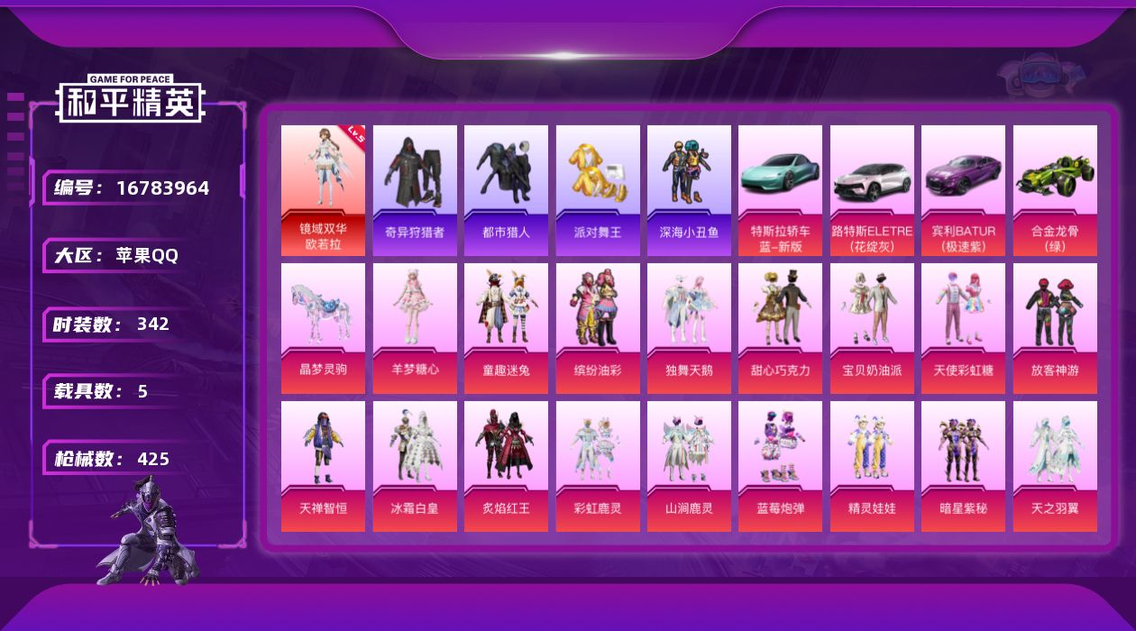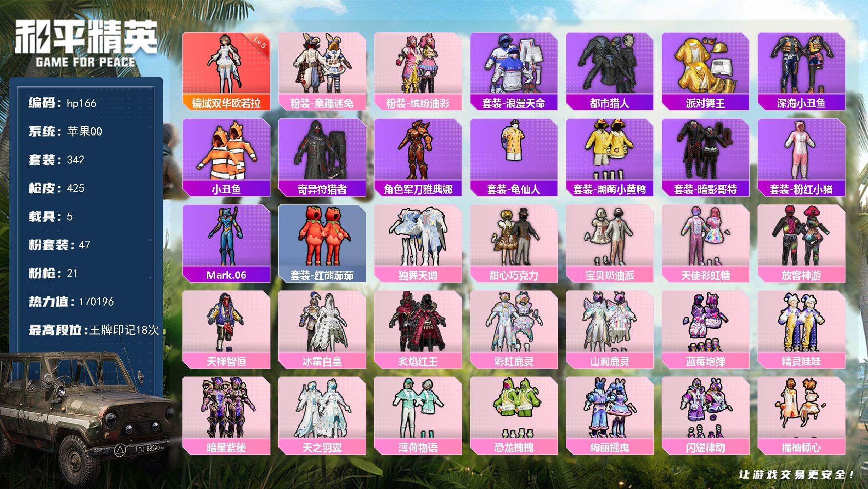 [16783964]苹果 手Q-1神装-47粉装-21特效枪-5载具-14粉色飞行器-170196热力值-18王牌印记-342套装-425枪皮