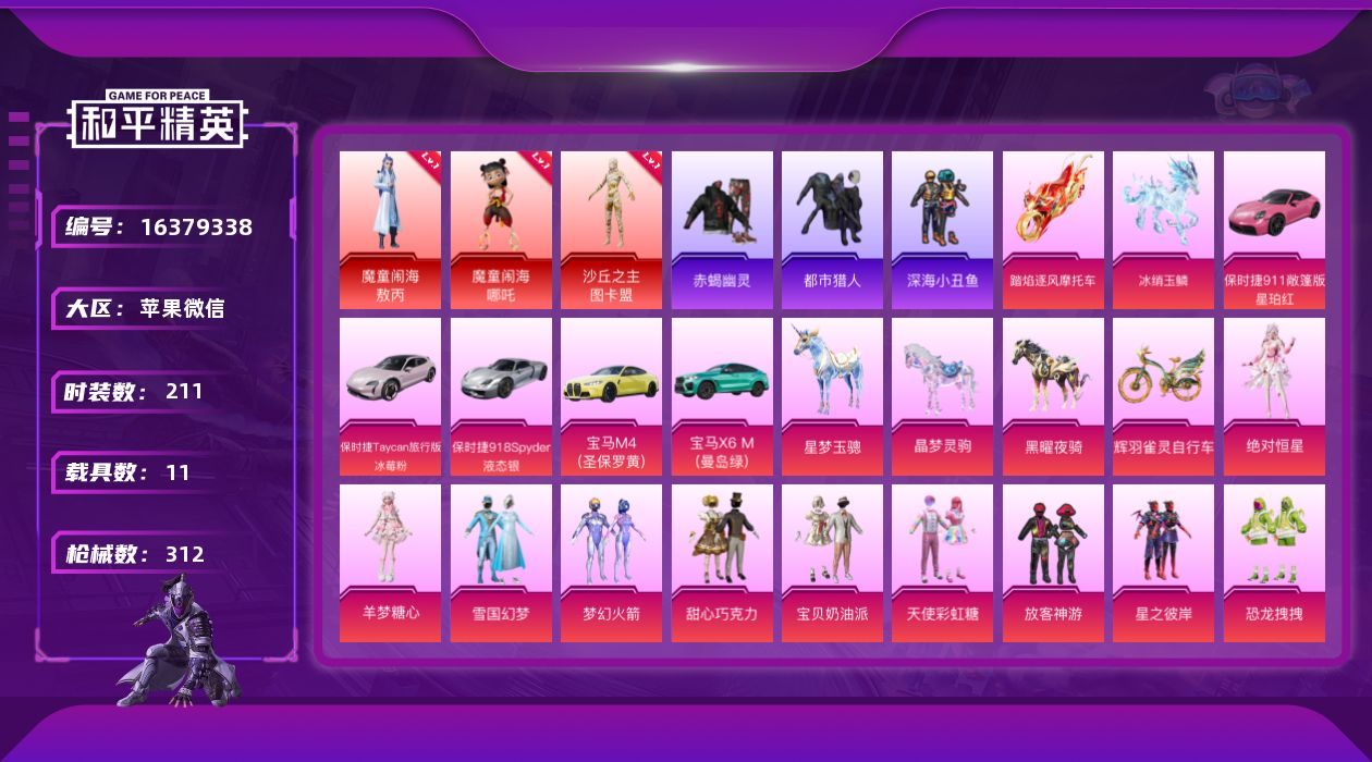 [16379338]【店主推荐捡漏号!可直接换绑】苹果 微信-4神装-32粉装-31特效枪-11载具-21粉色飞行器-124149热力值-7王牌印记-211套装-312枪皮【红色神装等级】:暮色玫影-艾丽娅(二级),魔童闹海-敖丙(一级),魔童闹海-哪吒(一级),沙丘之主-图卡盟(一级)【红色角色神装】:暮色玫影-艾丽娅,魔童闹海-敖丙,魔童闹海-哪吒,沙丘之主-图卡盟【热门品类】:粉装-雪国幻梦,粉装-梦幻火箭,套装-浪漫天命,套装-赤蝎幽灵,套装-都市猎人,套装-深海小丑鱼,套装-小丑鱼,套装-暗夜行者,角色-2B战斗服款,套装-暗影哥特,套装-软软马卡龙,角色-六号稻草人【粉色套装】:角色-绝对恒星,粉装-甜心巧克力,粉装-宝贝奶油派,粉装-天使彩虹糖,粉装-雪国幻梦,粉装-梦幻火箭,粉装-放客神游,粉装-星之彼岸,粉装-恐龙拽拽,角色-复仇流浪者,粉装-旋转彩虹,粉装-冰川幽秘,粉装-冰川红玫,粉装-第五大道,粉装-仲夏莫吉托,粉装-拂晓神骑,角色-星云暗核,角色-千金淑猫,角色-萨利娅,角色-樱桃泡泡,粉装-雪月幻音,角色-智耀战神,粉装-幻彩电音,角色-时光之吻,角色-狂魅哈莉,角色-冷漠罗丽,角色-宁雨蝶,角色-罗征,角色-荧海星豚,角色-绯穹魔姬,角色-奇迹舞步 美雪,角色-羊梦糖心【粉色枪皮等级】:AKM-幽焰骑士(三级),SCAR-L-魔童闹海 哪吒(三级),M416-风花雪月(三级),M416-灵猫魔法师(三级),GROZA-巴啦啦小魔仙(三级),GROZA-镜光银凌(五级),AUG-星梦奇缘(六级),AUG-暖羊咩咩(五级),M762-冷魅冰骑(一级),蜜獾-荧海星豚(五级),ARX-无垠阁(三级),UMP45-恐龙拽拽(二级),Vector-最终圣卫者(三级),Vector-绯穹魔姬(一级),AKS-74U-无垠阁(五级),P90-魔童闹海 敖丙(三级),Kar98K-巳巳如意(五级),Mk14-樱桃泡泡(三级),AMR-智耀战神(四级),M417-第五大道(一级),MK12-雪月幻音(五级),M249-绝对恒星(一级),DP-28-豹影疾电(五级),MG-36-幻彩电音(四级),MG-36-沧焰双生(五级),平底锅-仲夏莫吉托(一级),平底锅-喜羊羊与灰太狼(二级),烟雾弹-电雾迷城(一级),燃烧瓶-薄荷可可(四级),破片手榴弹-美味星星糖(六级)【粉色载