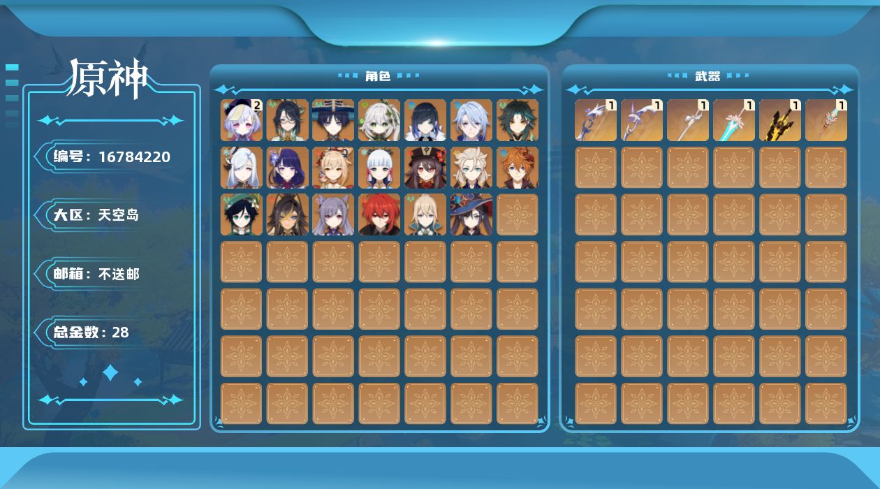 0命闲云,0命迪希雅,0命流浪者,0命纳西妲,0命夜兰,0命神里绫人,0命申鹤,0命雷电将军,0命神里绫华,0命胡桃,0命魈,0命宵宫,0命温迪,0命达达利亚,0命阿贝多,0命刻晴,2命七七,0命琴,0命莫娜,0命迪卢克,精1若水,精1无工之剑,精1天空之脊,精1阿莫斯之弓,精1风鹰剑,精1天空之傲