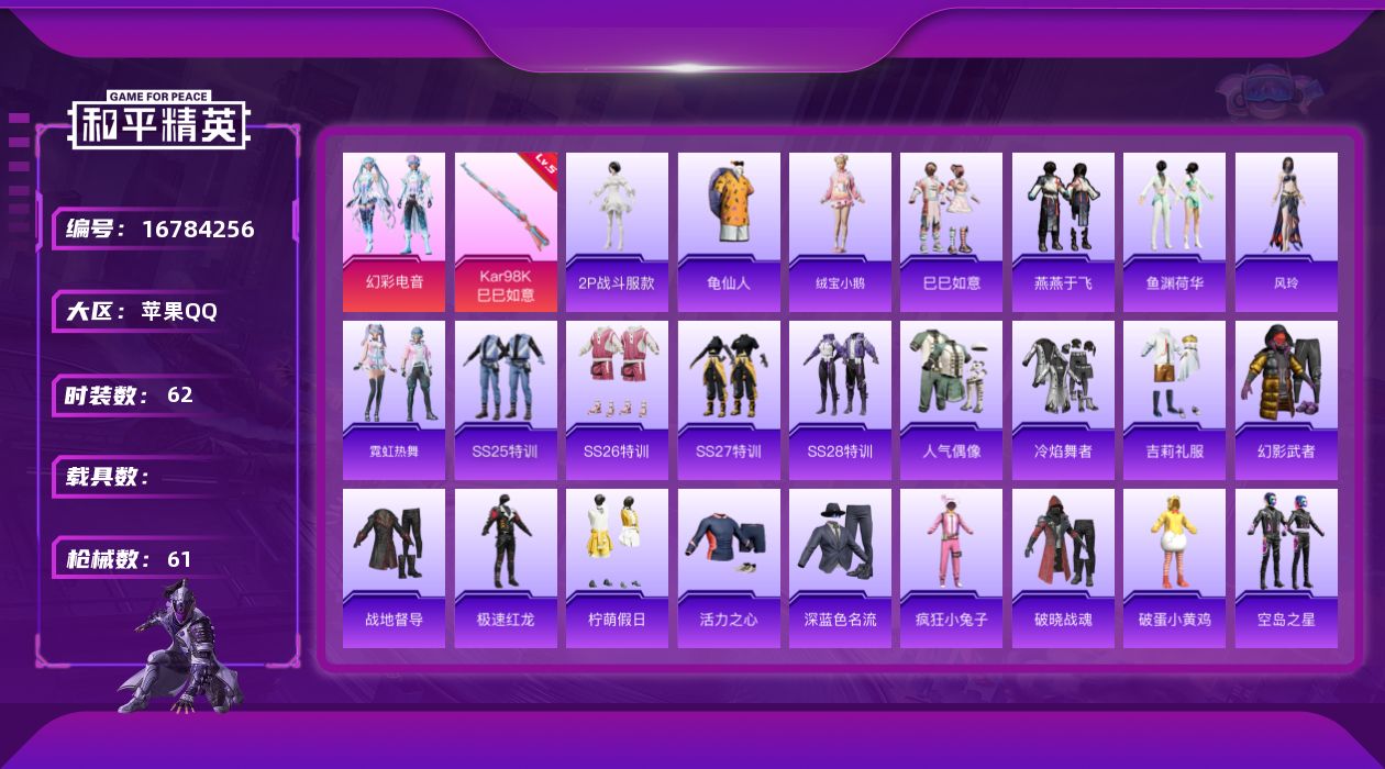 [16784256]苹果 手Q-2粉装-1特效枪-0载具-0粉色飞行器-19823热力值-1王牌印记-62套装-61枪皮 【热门品类】:角色-2P战斗服款,套装-龟仙人 【粉色套装】:粉装-幻彩电音 【粉色枪皮等级】:Kar98K-巳巳如意(五级) 【粉色枪皮】:Kar98K-巳巳如意 【粉色降落伞】:炫光之旅降落伞,赛博古神降落伞 【稀有套装】:套装-龟仙人,套装-绒宝小鹅,套装-巳巳如意,套装-燕燕于飞,套装-鱼渊荷华,角色-风玲,套装-霓虹热舞 【稀有枪皮】:AKM-2P战斗服款,AKM-江南烟雨,AKM-龙的传人,SCAR-L-炫彩节奏,M416-糯团青竹,AUG-2P战斗服款,Mk47-炫光之旅,AC-VAL-天降萌叽,AC-VAL-快闪甜心,蜜獾-天降萌叽,UZI-啾咪啾咪,UZI-天降萌叽,汤姆逊-天降萌叽,P90-快闪甜心,P90-飞驰魅影,P90-巳巳如意,SKS-炫彩节奏,M417-惊鸿侠骨,MK20-H-快闪甜心,M200-惊鸿侠骨,S12K-极意拳锋,DBS-第五大道,M249-彩虹符号,MG3-幻世战舞者,MG3-惊鸿侠骨,MG3-第五大道,沙漠之鹰-快闪甜心,爆炸猎弓-惊鸿侠骨,大砍刀-2P战斗服款,破片手榴弹-巳巳如意 【其他套装】:套装-SS25特训,套装-SS26特训,套装-SS27特训,套装-SS28特训,套装-人气偶像,套装-冷焰舞者,套装-吉莉礼服,套装-幻影武者,套装-战地督导,套装-极速红龙,套装-柠萌假日,套装-活力之心,套装-深蓝色名流,套装-疯狂小兔子,套装-破晓战魂,套装-破蛋小黄鸡,套装-空岛之星,套装-竞技名士,套装-绮丽涂鸦,套装-绯格组合,套装-缤纷果语,套装-耀粉歌者,套装-蓝彩潮人,套装-街头潮人,套装-迎春赐吉,套装-都市魅力,套装-长空猛禽,套装-霓虹街区,套装-魅力单车,套装-鹤鸣,套装-龙的传人,套装-龟仙人,套装-莱茵河畔,套装-香榭午后,套装-惊鸿侠骨,套装-锦衣飞扬,角色-2P战斗服款,套装-快闪甜心,套装-春光漫游,套装-贝斯之夜,套装-璀璨流光,套装-热情海星 【稀有头盔】:梦幻火箭头盔(2级) 【营地ID】:741531459