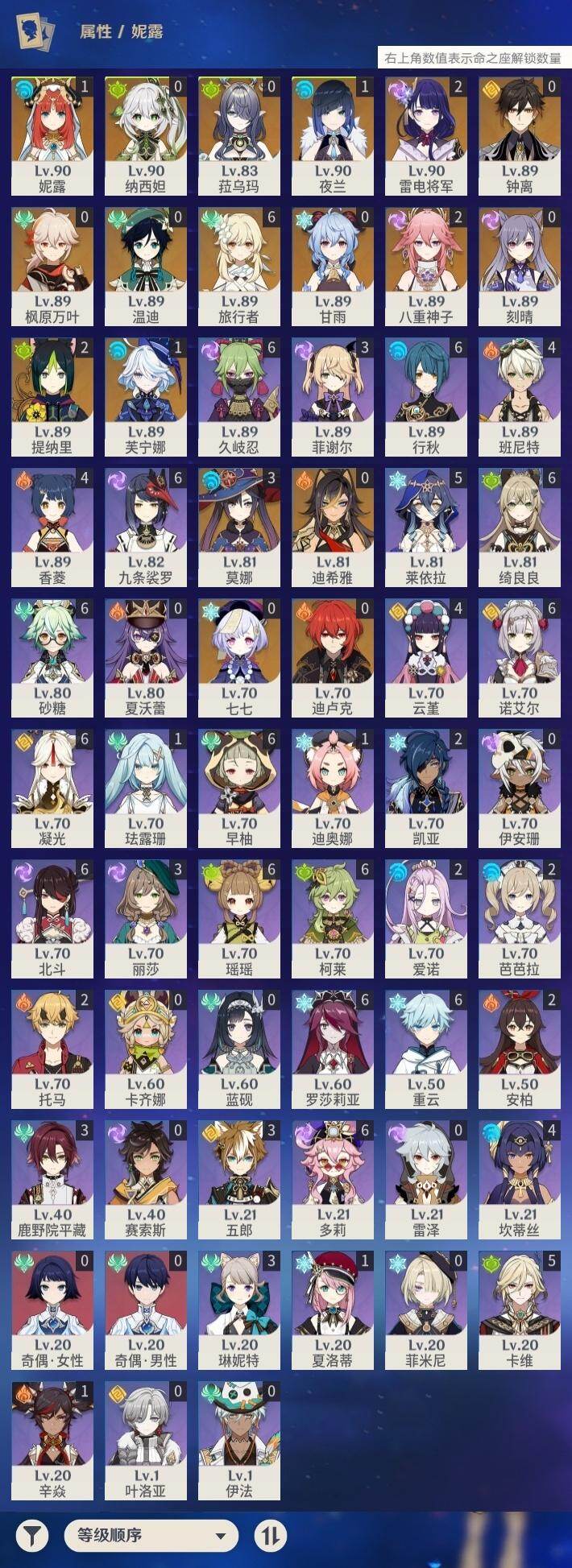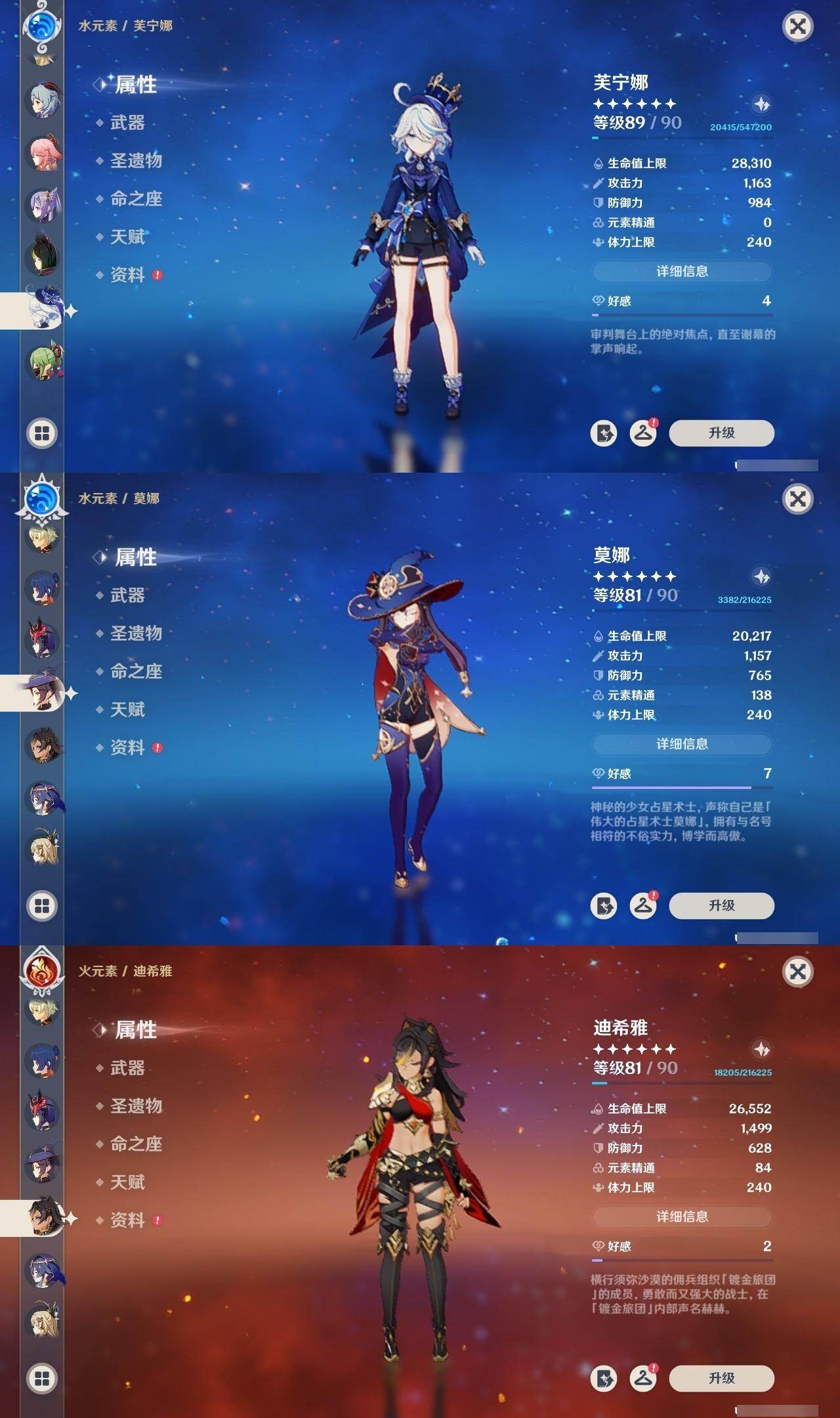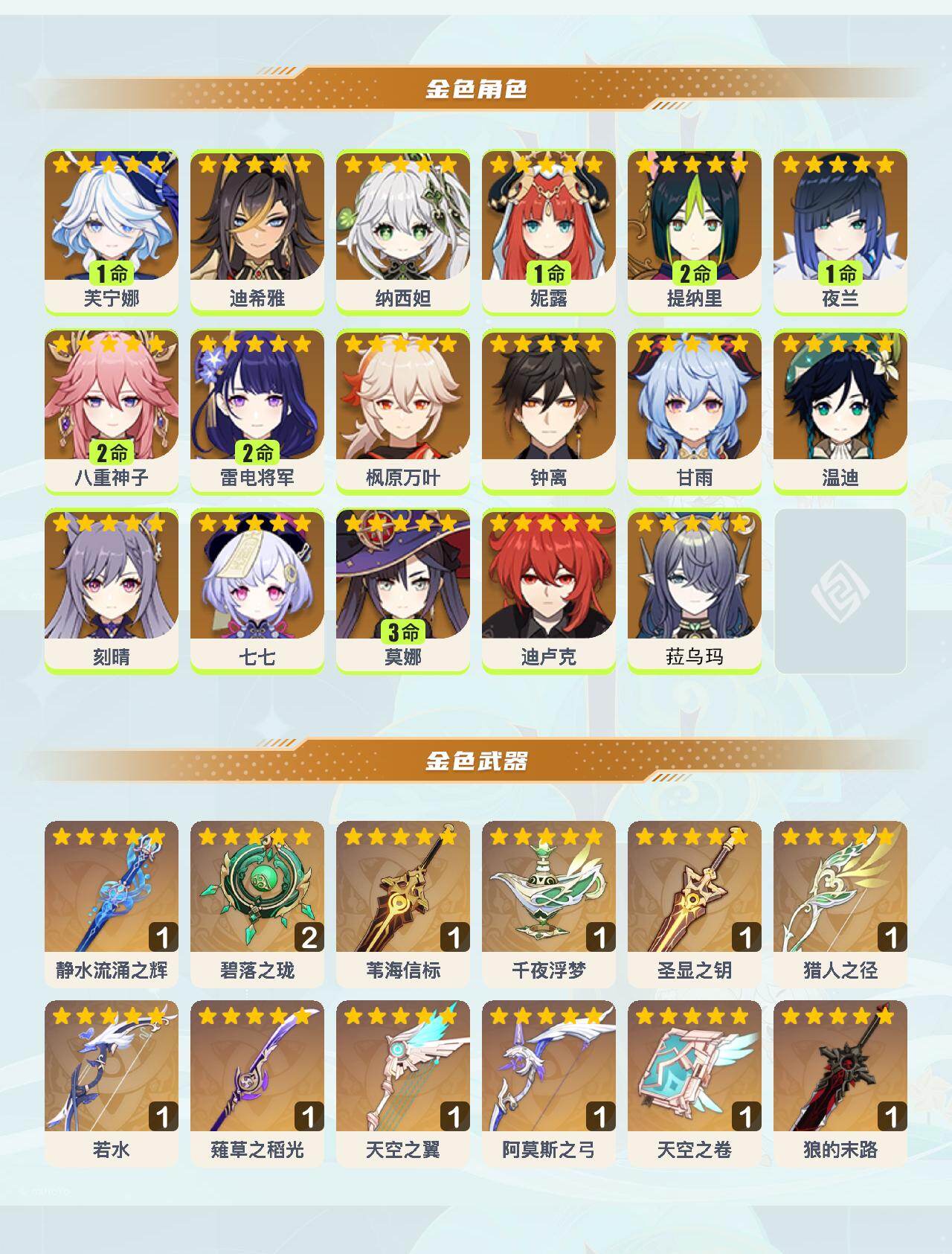1命芙宁娜,0命迪希雅,0命纳西妲,1命妮露,2命提纳里,1命夜兰,2命八重神子,2命雷电将军,0命枫原万叶,0命钟离,0命甘雨,0命温迪,0命刻晴,0命七七,3命莫娜,0命迪卢克,0命菈乌玛,精1静水流涌之辉,精2碧落之珑,精1苇海信标,精1千夜浮梦,精1圣显之钥,精1猎人之径,精1若水,精1薙草之稻光,精1天空之翼,精1阿莫斯之弓,精1天空之卷,精1狼的末路