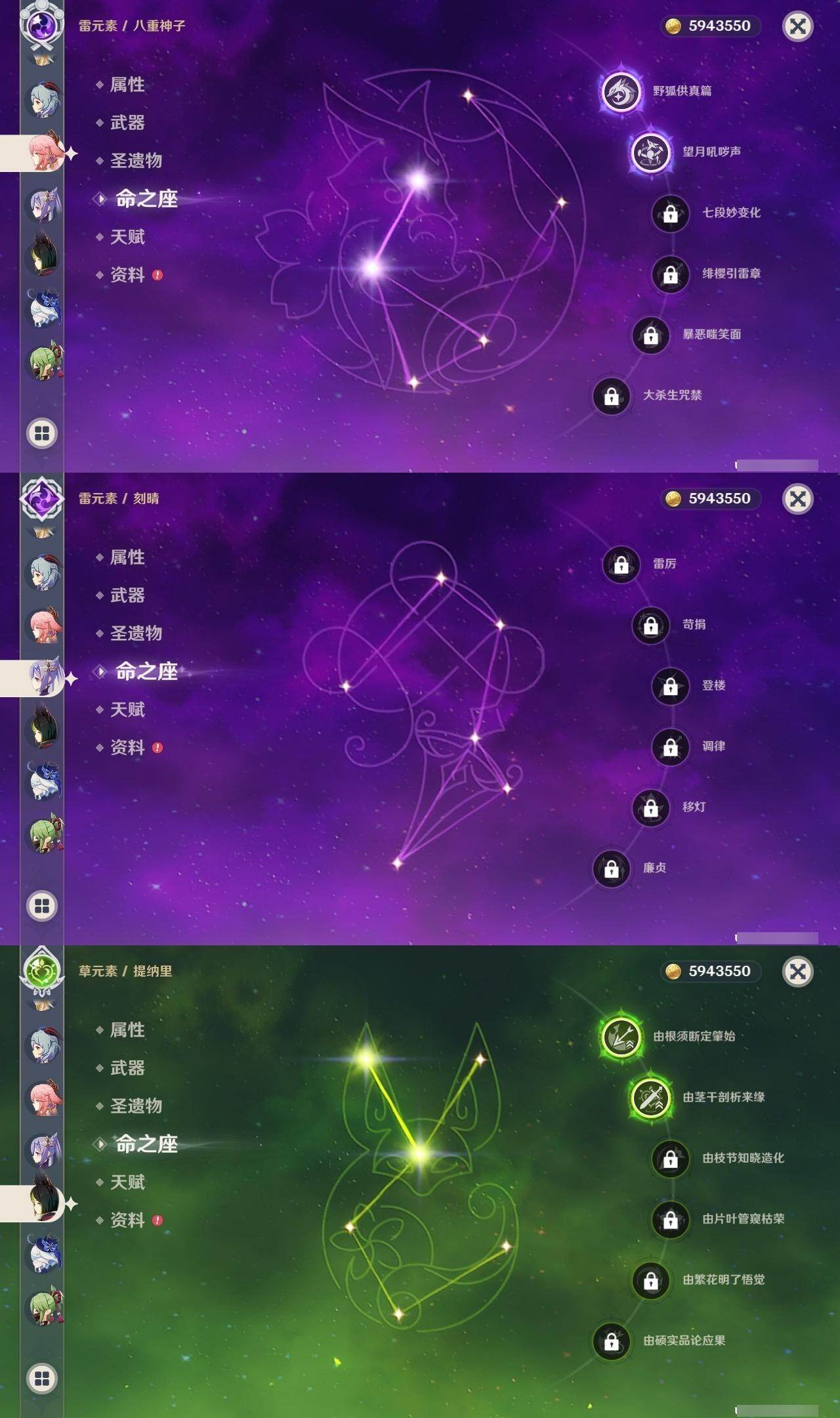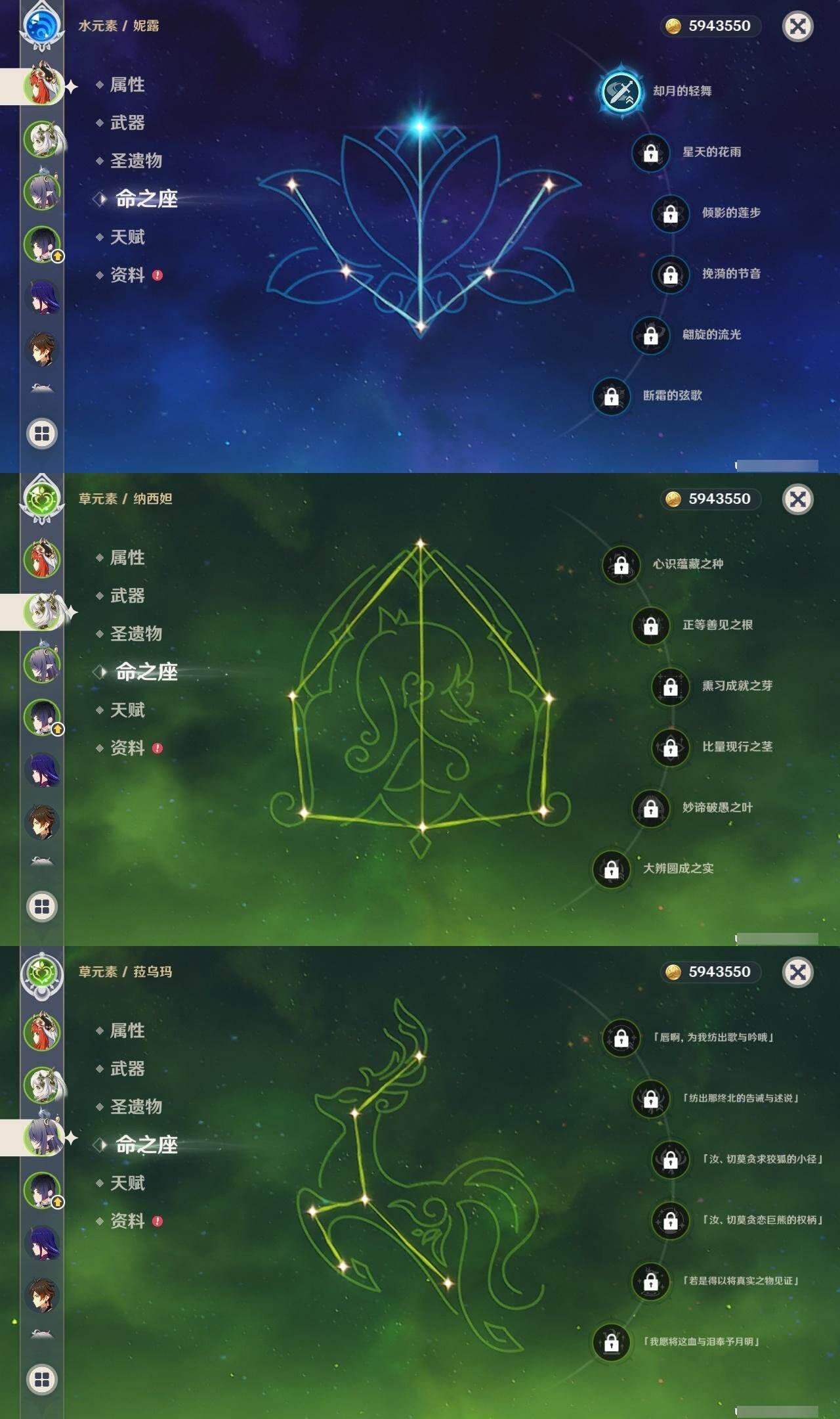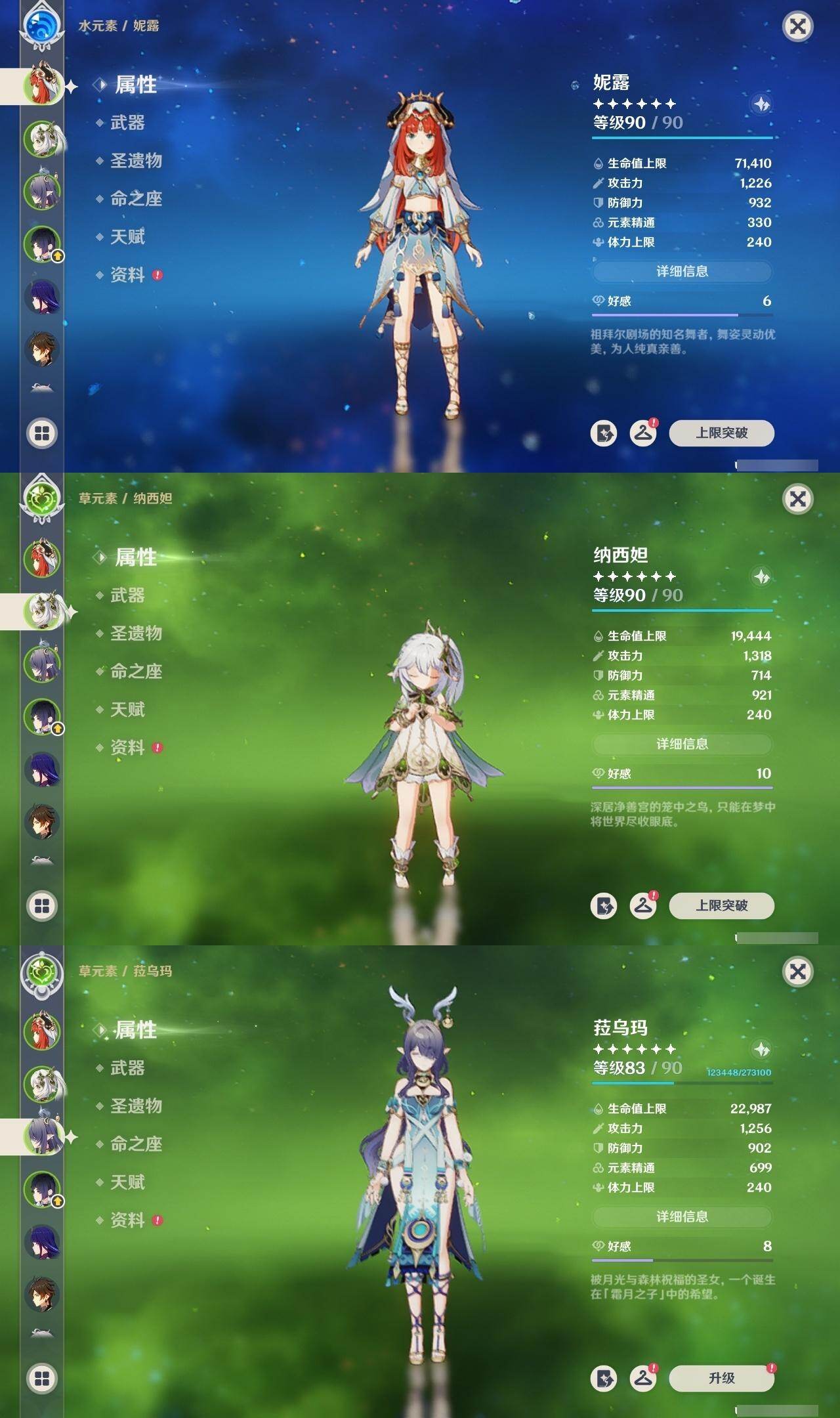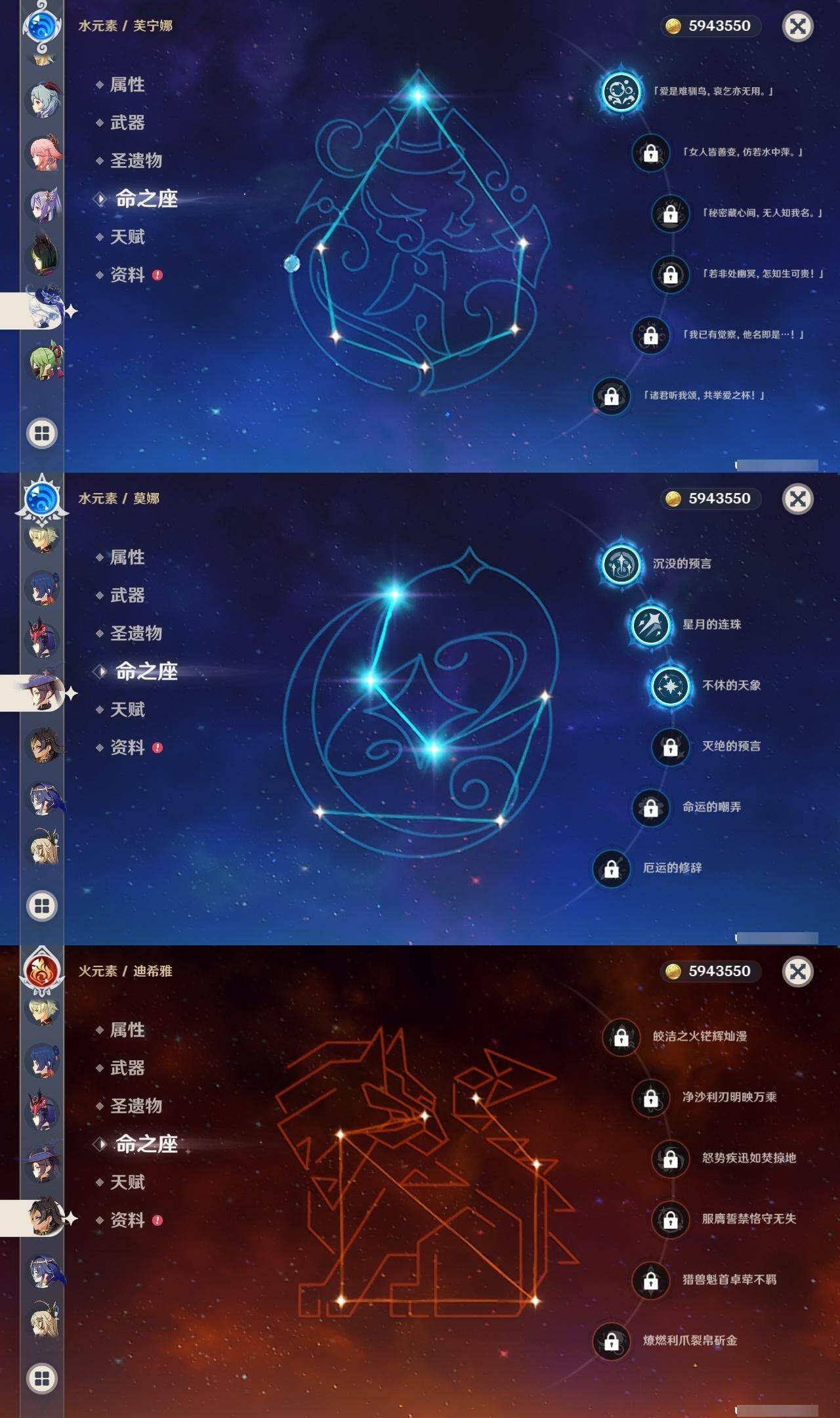 1命芙宁娜,0命迪希雅,0命纳西妲,1命妮露,2命提纳里,1命夜兰,2命八重神子,2命雷电将军,0命枫原万叶,0命钟离,0命甘雨,0命温迪,0命刻晴,0命七七,3命莫娜,0命迪卢克,0命菈乌玛,精1静水流涌之辉,精2碧落之珑,精1苇海信标,精1千夜浮梦,精1圣显之钥,精1猎人之径,精1若水,精1薙草之稻光,精1天空之翼,精1阿莫斯之弓,精1天空之卷,精1狼的末路