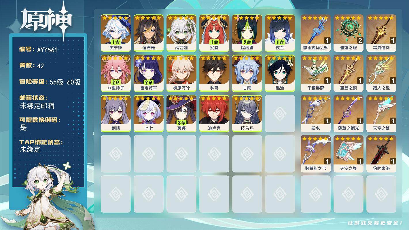 [16784814]60级/42黄/女主/17个五星角色/12个五星武器 1命芙宁娜,0命迪希雅,0命纳西妲,1命妮露,2命提纳里,1命夜兰,2命八重神子,2命雷电将军,0命枫原万叶,0命钟离,0命甘雨,0命温迪,0命刻晴,0命七七,3命莫娜,0命迪卢克,0命菈乌玛,精1静水流涌之辉,精2碧落之珑,精1苇海信标,精1千夜浮梦,精1圣显之钥,精1猎人之径,精1若水,精1薙草之稻光,精1天空之翼,精1阿莫斯之弓,精1天空之卷,精1狼的末路