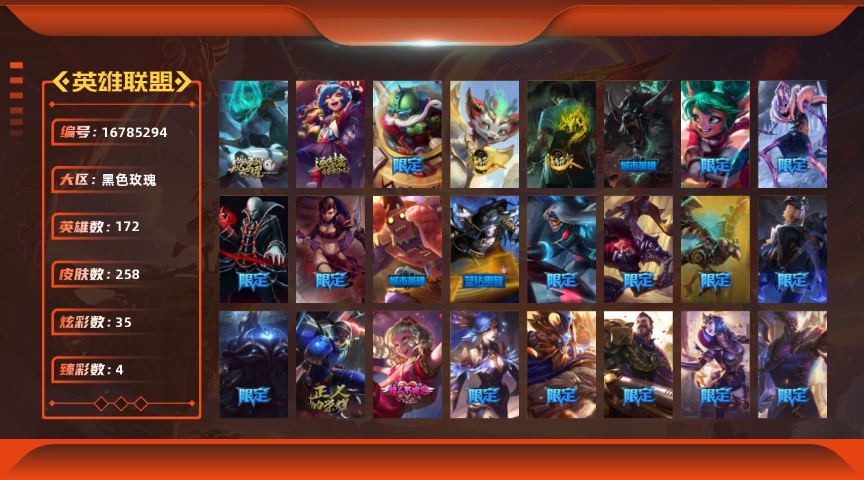 [16785294]未定级段位-172英雄-258皮肤-35炫彩-0终极-2神话-51限定-15传说-73史诗