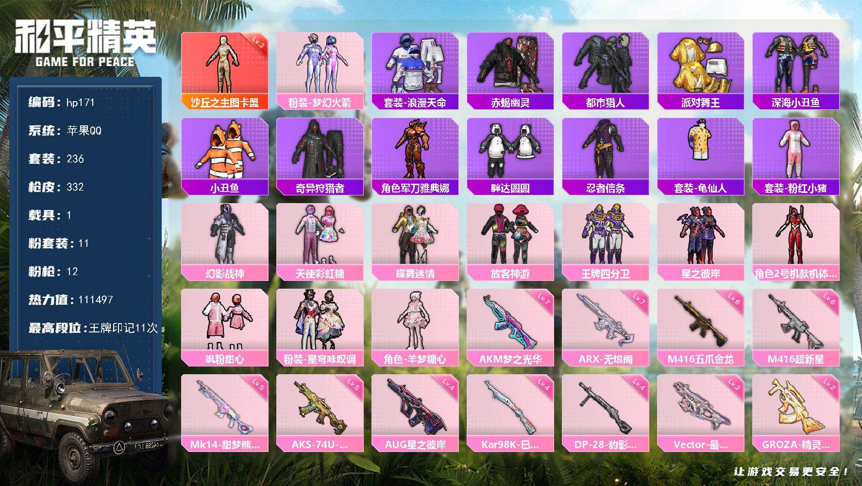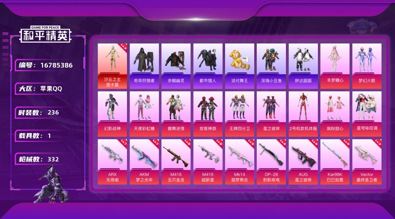 [16785386]苹果 手Q-1神装-11粉装-12特效枪-1载具-5粉色飞行器-111497热力值-11王牌印记-236套装-332枪皮