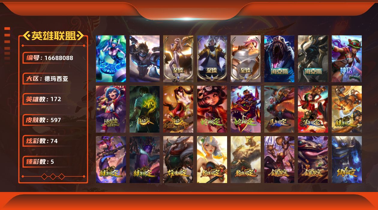 [16688088]【店主推荐捡漏号】未定级段位-172英雄-597皮肤-74炫彩-2终极-7神话-99限定-43传说-162史诗