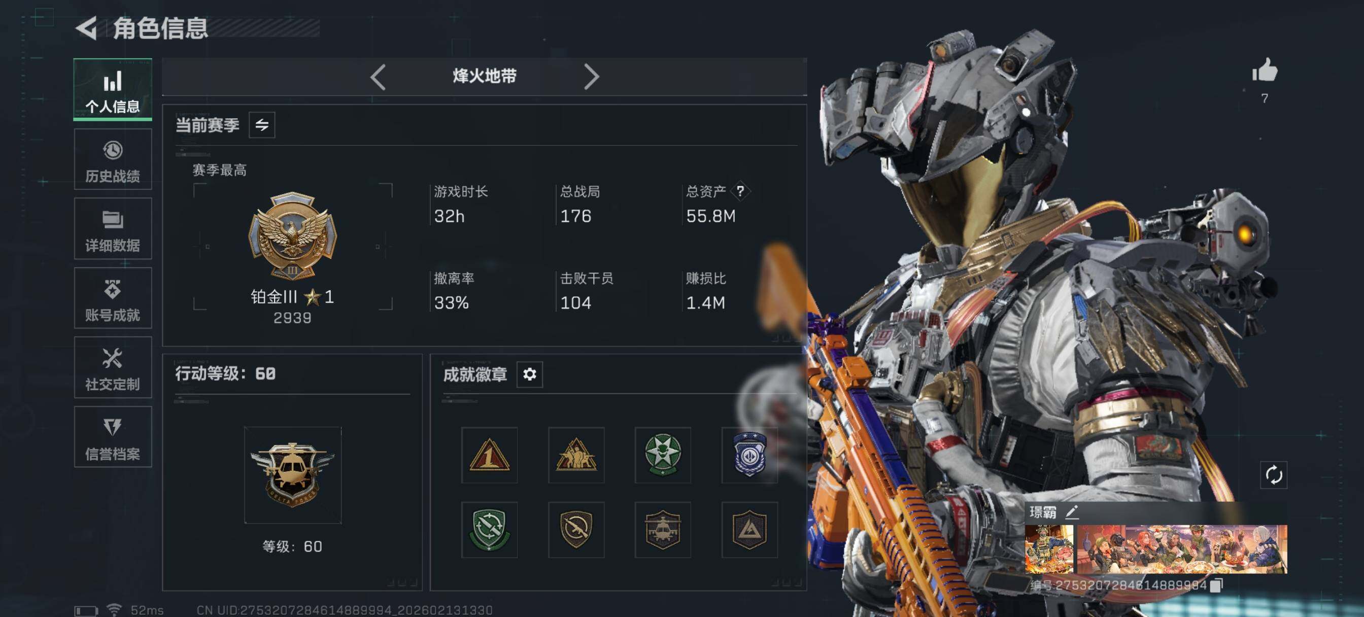 [16786137]可二次【特价出售/店主推荐】55m总资产-641k哈伏币-60烽火等级-铂金-19战场等级-上等兵