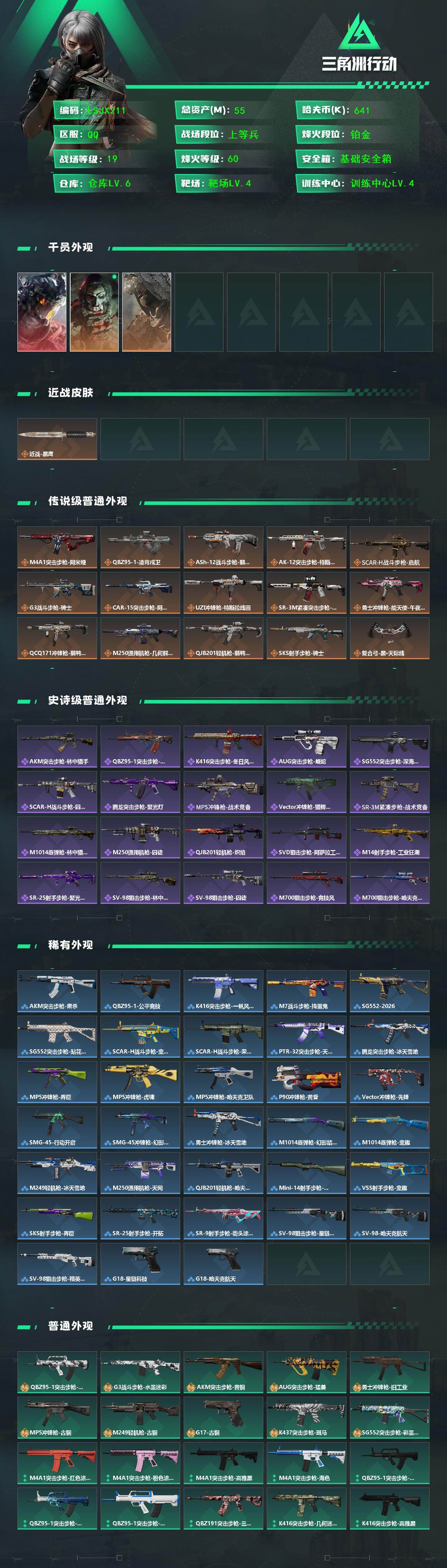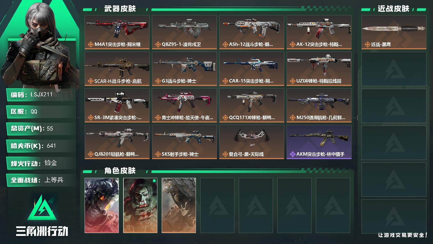 [16786137]可二次【特价出售/店主推荐】55m总资产-641k哈伏币-60烽火等级-铂金-19战场等级-上等兵 【干员外观】:威龙-凌霄戍卫,红狼-电锯惊魂,乌鲁鲁-荒原猎手 【近战皮肤】:近战-黑鹰 【传说外观】:M4A1突击步枪-阿米娅,QBZ95-1突击步枪-凌霄戍卫,ASh-12战斗步枪-鹅鸭杀,AK-12突击步枪-特斯拉线圈,SCAR-H战斗步枪-启航,G3战斗步枪-骑士,CAR-15突击步枪-阿米娅,UZI冲锋枪-特斯拉线圈,SR-3M紧凑突击步枪-特斯拉线圈,勇士冲锋枪-能天使-午夜邮差,QCQ171冲锋枪-鹅鸭杀,M250通用机枪-几何解构,QJB201轻机枪-鹅鸭杀,SKS射手步枪-骑士,复合弓-黑·天际线 【史诗外观】:AKM突击步枪-林中猎手,QBZ95-1突击步枪-曙光,K416突击步枪-冬日风情,AUG突击步枪-蝮蛇,SG552突击步枪-深海恐惧,SCAR-H战斗步枪-囚徒,腾龙突击步枪-聚光灯,MP5冲锋枪-战术竞备,Vector冲锋枪-猎鳄行动,SR-3M紧凑突击步枪-战术竞备,M1014霰弹枪-林中猎手,M250通用机枪-囚徒,QJB201轻机枪-炽焰,SVD狙击步枪-阿萨拉工艺,M14射手步枪-工业狂潮,SR-25射手步枪-聚光灯,SV-98狙击步枪-林中猎手,SV-98狙击步枪-囚徒,M700狙击步枪-竞技风,M700狙击步枪-哈夫克警备 【稀有外观】:AKM突击步枪-肃杀,QBZ95-1突击步枪-公平竞技,K416突击步枪-一帆风顺,M7战斗步枪-捣蛋鬼,SG552突击步枪-2026,SG552突击步枪-贴花艺术,SCAR-H战斗步枪-童趣,SCAR-H战斗步枪-荣耀列队,PTR-32突击步枪-天网,腾龙突击步枪-冰天雪地,MP5冲锋枪-弄臣,MP5冲锋枪-虎啸,MP5冲锋枪-哈夫克卫队,P90冲锋枪-黄昏,Vector冲锋枪-先锋,SMG-45-行动开启,SMG-45冲锋枪-幻影结构,勇士冲锋枪-冰天雪地,M1014霰弹枪-幻影结构,M1014霰弹枪-童趣,M249轻机枪-冰天雪地,M250通用机枪-天网,QJB201轻机枪-哈夫克卫队,Mini-14射手步枪-荣耀列队,VSS射手步枪-童趣,SKS射手步枪-弄臣,SR-25射手步枪-开拓,SR-9射手步枪-街头涂鸦,SV-98狙击步枪-星链科技,SV-98狙击步枪-哈夫克航天,SV-9