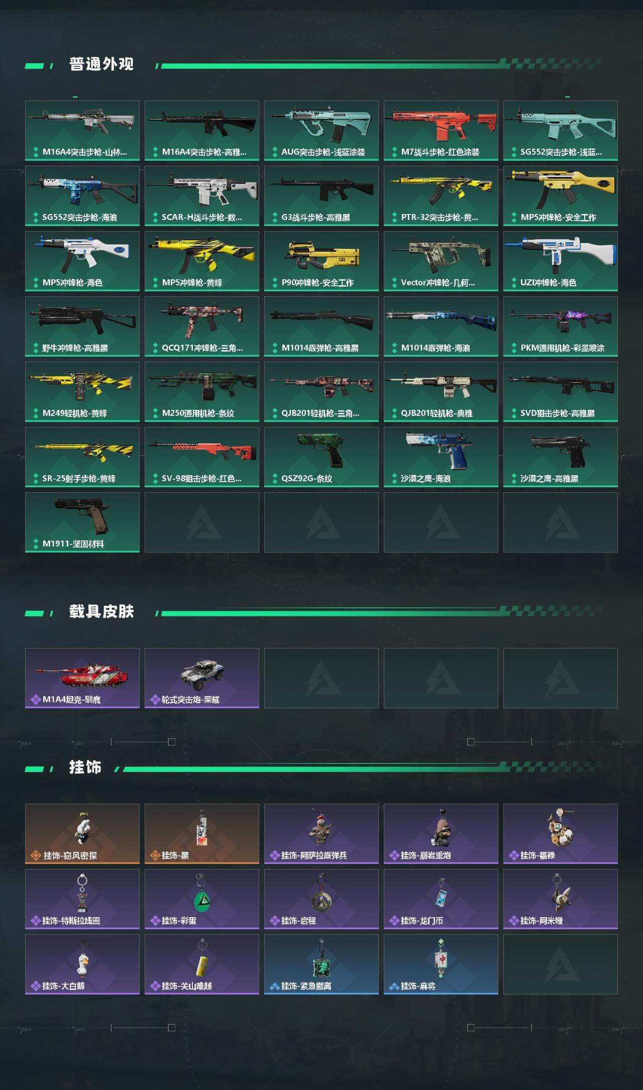 【稀有外观】:AKM突击步枪-肃杀,QBZ95-1突击步枪-公平竞技,K416突击步枪-一帆风顺,M7战斗步枪-捣蛋鬼,SG552突击步枪-2026,SG552突击步枪-贴花艺术,SCAR-H战斗步枪-童趣,SCAR-H战斗步枪-荣耀列队,PTR-32突击步枪-天网,腾龙突击步枪-冰天雪地,MP5冲锋枪-弄臣,MP5冲锋枪-虎啸,MP5冲锋枪-哈夫克卫队,P90冲锋枪-黄昏,Vector冲锋枪-先锋,SMG-45-行动开启,SMG-45冲锋枪-幻影结构,勇士冲锋枪-冰天雪地,M1014霰弹枪-幻影结构,M1014霰弹枪-童趣,M249轻机枪-冰天雪地,M250通用机枪-天网,QJB201轻机枪-哈夫克卫队,Mini-14射手步枪-荣耀列队,VSS射手步枪-童趣,SKS射手步枪-弄臣,SR-25射手步枪-开拓,SR-9射手步枪-街头涂鸦,SV-98狙击步枪-星链科技,SV-98狙击步枪-哈夫克航天,SV-9