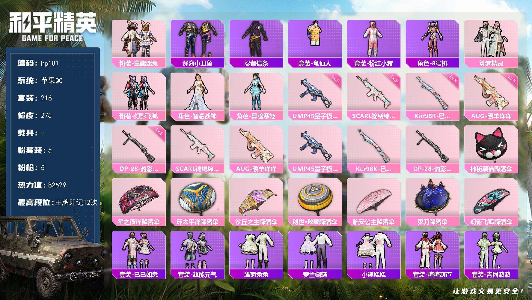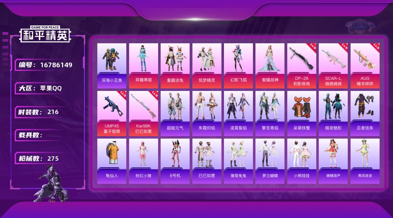 [16786149]苹果 手Q-5粉装-5特效枪-0载具-1粉色飞行器-82529热力值-12王牌印记-216套装-275枪皮 【热门品类】:粉装-童趣迷兔,套装-深海小丑鱼,套装-忍者信条,套装-龟仙人,套装-粉红小猪,角色-8号机 【粉色套装】:粉装-童趣迷兔,粉装-筑梦精灵,粉装-幻影飞狐,角色-智耀战神,角色-异瞳寒姬 【粉色枪皮等级】:SCAR-L-锦绣绵绵(五级),AUG-暖羊咩咩(五级),UMP45-量子极限(五级),Kar98K-巳巳如意(五级),DP-28-豹影疾电(五级) 【粉色枪皮】:SCAR-L-锦绣绵绵,AUG-暖羊咩咩,UMP45-量子极限,Kar98K-巳巳如意,DP-28-豹影疾电 【粉色飞行器】:炫彩糖果飞行器 【粉色降落伞】:神秘黑猫降落伞,星之彼岸降落伞,环太平洋降落伞,沙丘之主降落伞,创世·救赎降落伞,临安公主降落伞,鬼刀降落伞,幻影飞狐降落伞,炫彩糖果降落伞 【稀有套装】:套装-龟仙人,套装-巳巳如意,套装-超能元气,套装-雪国风尚,套装-炫彩糖果,套装-雏菊兔兔,套装-萝兰蝴蝶,套装-小熊娃娃,套装-糖糖葫芦,套装-青团波波,套装-棉花软糖,角色-临安公主,套装-燕燕于飞,套装-鱼渊荷华,角色-海琴烟,套装-樱梦幻音,套装-粉恋花,套装-紫幽梦,套装-蓝冰羽,套装-极速光影,套装-云朵鹅,套装-雪绒豹,套装-朱霞炽焰,套装-凌霄紫焰,套装-擎苍青焰 【稀有枪皮】:AUG-冰晶雪宝,AKM-墨染幽兰,AKM-夜灯,AKM-小鹦鹉BEBE,AKM-彩虹符号,AKM-影袭,AKM-灼热熔岩,AKM-破晓战魂,AKM-胡桃卫兵,AKM-萌趣颜团子,AKM-虎虎生威,AKM-霓虹街区,M16A4-夜灯,M16A4-幻世战舞者,M16A4-甜心亚梦,M16A4-红色方程式,M16A4-蓝色火焰,SCAR-L-夜灯,SCAR-L-炫彩节奏,SCAR-L-玉兔迎春,SCAR-L-红色方程式,M416-夜灯,M416-糯团青竹,M416-红色方程式,M416-蓝色火焰,GROZA-异彩先驱,GROZA-彩虹符号,GROZA-影袭,GROZA-恐龙拽拽,GROZA-生命誓言,AUG-天降萌叽,AUG-甜蜜菠萝,AUG-耀粉歌者,QBZ-原初圣火,QBZ-彩虹符号,QBZ-飞驰魅影,M762-天降萌叽,M762-奇异狩猎者,M762-彩虹符号,M762-橘柚倾心