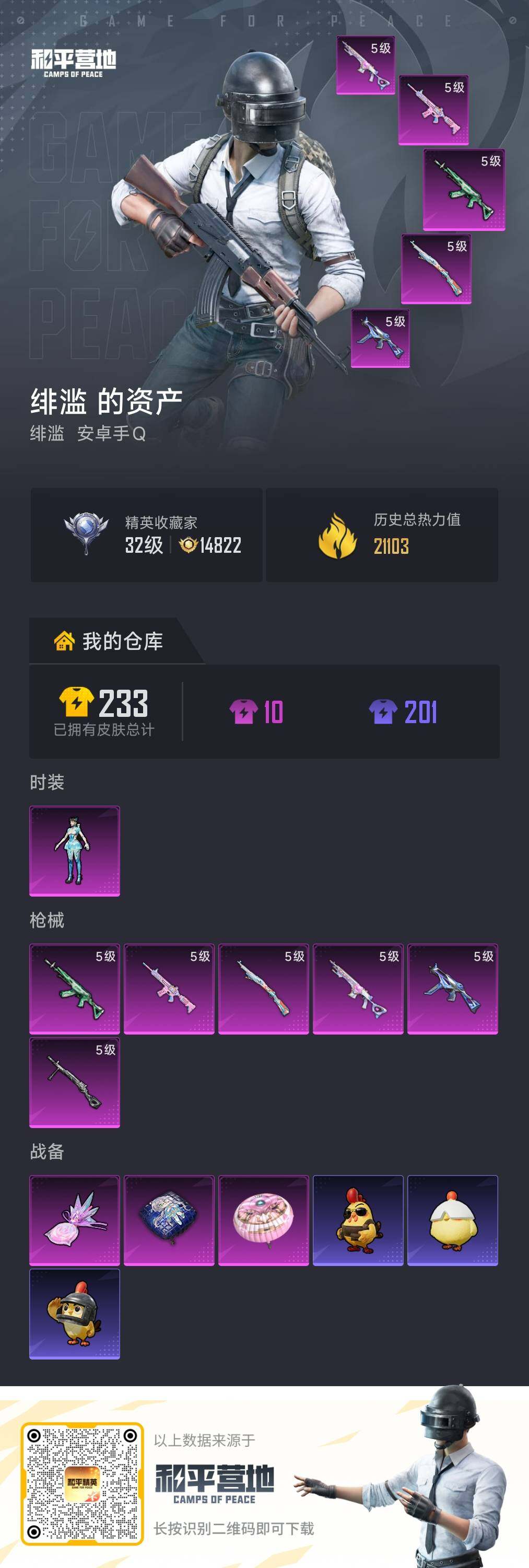 [16786221]安卓 手Q-1粉装-6特效枪-0载具-1粉色飞行器-21103热力值-1王牌印记-33套装-76枪皮