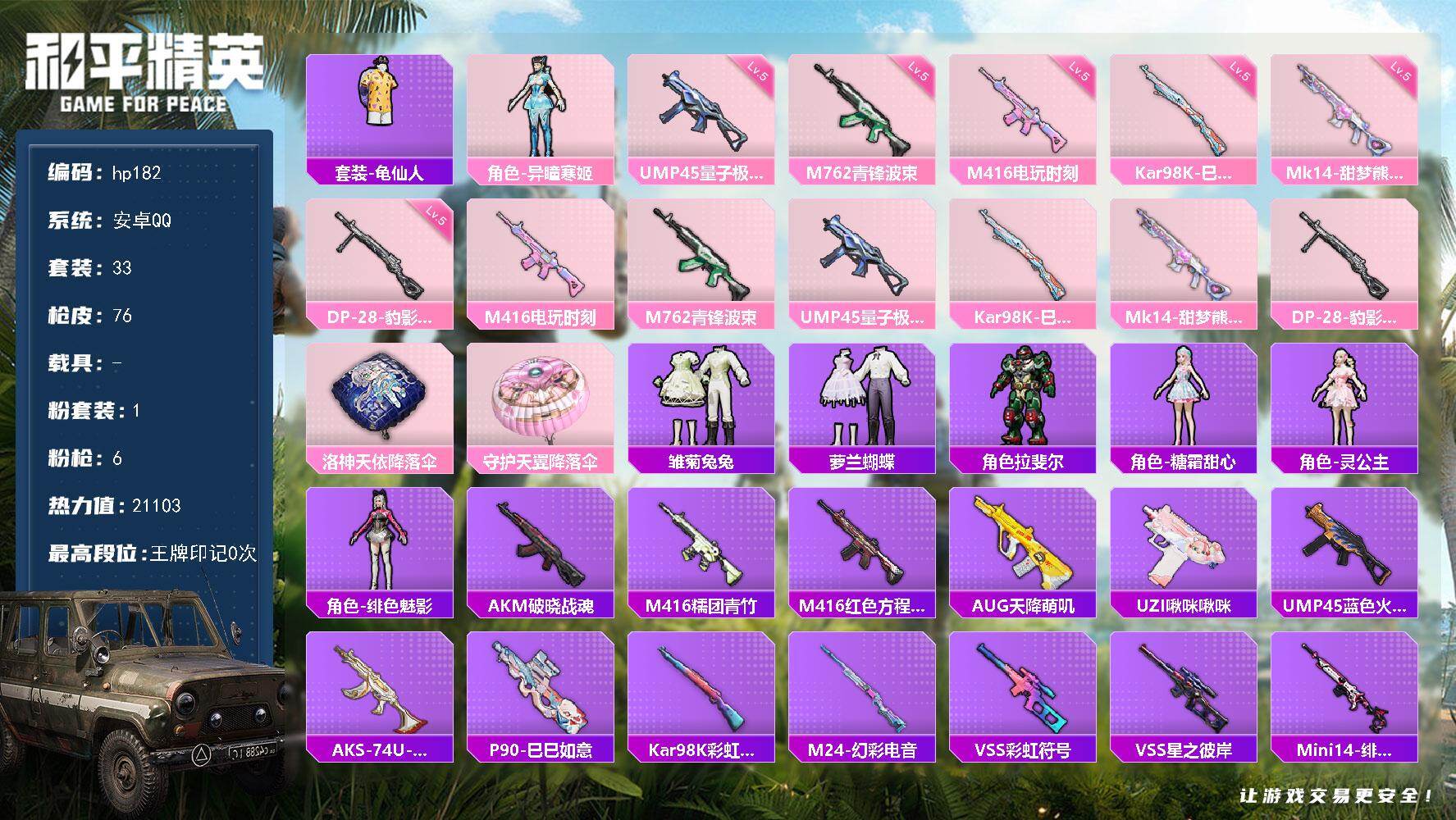 [16786221]安卓 手Q-1粉装-6特效枪-0载具-1粉色飞行器-21103热力值-1王牌印记-33套装-76枪皮 【热门品类】:套装-龟仙人 【粉色套装】:角色-异瞳寒姬 【粉色枪皮等级】:M416-电玩时刻(五级),M762-青锋波束(五级),UMP45-量子极限(五级),Kar98K-巳巳如意(五级),Mk14-甜梦熊击(五级),DP-28-豹影疾电(五级) 【粉色枪皮】:M416-电玩时刻,M762-青锋波束,UMP45-量子极限,Kar98K-巳巳如意,Mk14-甜梦熊击,DP-28-豹影疾电 【粉色飞行器】:炫彩糖果飞行器 【粉色降落伞】:洛神天依降落伞,守护天翼降落伞 【稀有套装】:套装-龟仙人,套装-雪国风尚,套装-雏菊兔兔,套装-萝兰蝴蝶,角色-拉斐尔,角色-糖霜甜心,角色-灵公主,角色-绯色魅影 【稀有枪皮】:AKM-破晓战魂,M416-糯团青竹,M416-红色方程式,AUG-天降萌叽,UZI-啾咪啾咪,UMP45-蓝色火焰,AKS-74U-鬼刀,P90-巳巳如意,Kar98K-彩虹符号,M24-幻彩电音,VSS-彩虹符号,VSS-星之彼岸,Mini14-绯穹魔姬,S686-彩虹符号,S12K-玩趣呆呆,S12K-夜灯,DBS-幻彩电音,M249-彩虹符号,MG3-幻世战舞者,蝎式手枪-闲梦青缨 【其他套装】:套装-SS26特训,套装-SS27特训,套装-SS28特训,套装-SS29特训,套装-缤纷果语,套装-长空猛禽,套装-龟仙人,套装-纯真浪花,套装-热情海星 【营地ID】:968820963