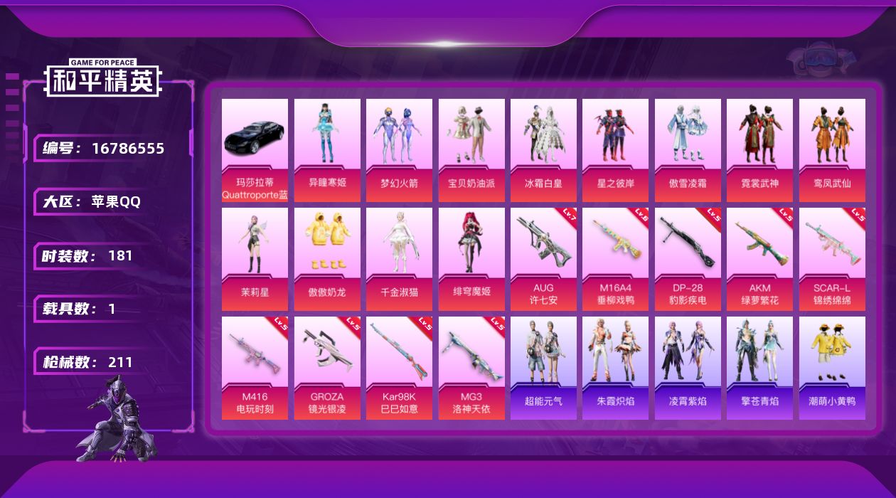 [16786555]苹果 手Q-12粉装-9特效枪-1载具-3粉色飞行器-72841热力值-10王牌印记-181套装-211枪皮 【热门品类】:粉装-梦幻火箭,套装-浪漫天命,角色-军刀雅典娜,套装-龟仙人,套装-潮萌小黄鸭,套装-浪漫波比,角色-Mark.06 【粉色套装】:粉装-宝贝奶油派,粉装-梦幻火箭,粉装-冰霜白皇,粉装-星之彼岸,粉装-傲雪凌霜,粉装-霓裳武神,粉装-鸾凤武仙,角色-茉莉星,粉装-傲傲奶龙,角色-千金淑猫,角色-绯穹魔姬,角色-异瞳寒姬 【粉色枪皮等级】:AKM-绿萝繁花(五级),M16A4-垂柳戏鸭(六级),SCAR-L-锦绣绵绵(五级),M416-电玩时刻(五级),GROZA-镜光银凌(五级),AUG-许七安(七级),Kar98K-巳巳如意(五级),DP-28-豹影疾电(五级),MG3-洛神天依(五级) 【粉色载具】:玛莎拉蒂Quattroporte(夜幕蓝) 【粉色枪皮】:AKM-绿萝繁花,M16A4-垂柳戏鸭,SCAR-L-锦绣绵绵,M416-电玩时刻,GROZA-镜光银凌,AUG-许七安,Kar98K-巳巳如意,DP-28-豹影疾电,MG3-洛神天依 【粉色飞行器】:炫彩糖果飞行器,春暖花开飞行器 【粉色降落伞】:绝对恒星降落伞,甜心宝贝降落伞,春暖花开降落伞,梦幻火箭降落伞,神秘黑猫降落伞,洛神天依降落伞,环太平洋降落伞,垂柳戏鸭降落伞,江南烟雨降落伞,精灵梦叶罗丽降落伞,忍者神龟降落伞,临安公主降落伞,樱桃泡泡降落伞,星穹咏叹调降落伞,荧海星豚降落伞,喜羊羊与灰太狼降落伞,炫彩糖果降落伞 【稀有套装】:套装-龟仙人,套装-巳巳如意,套装-超能元气,套装-雪国风尚,套装-炫彩糖果,套装-雏菊兔兔,套装-萝兰蝴蝶,套装-小熊娃娃,角色-狂花道·娜可露露,套装-糖糖葫芦,套装-青团波波,套装-棉花软糖,角色-都市丽猫,套装-燕燕于飞,套装-鱼渊荷华,玩偶服-小狗蛇点点,套装-风舞幻音,套装-粉恋花,套装-紫幽梦,套装-蓝冰羽,套装-彩虹兔,套装-云朵鹅,套装-雪绒豹,角色-时希公主,套装-蓝海鲸歌,套装-朱霞炽焰,套装-凌霄紫焰,套装-擎苍青焰 【稀有枪皮】:AKM-春暖花开,AKM-虎虎生威,AKM-龙的传人,M16A4-幻世战舞者,M16A4-甜心亚梦,SCAR-L-夜灯,SCAR-L-玉兔迎春,SCAR-L-红色方程式,SCAR-L-小狗蛇点