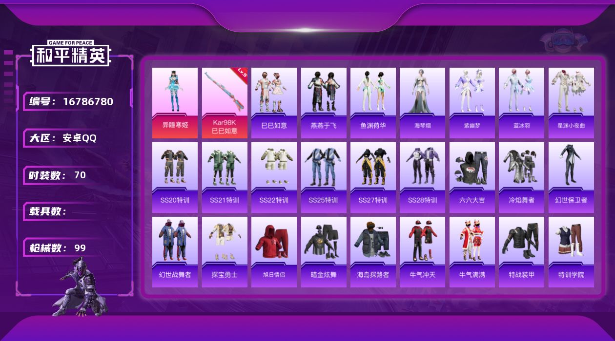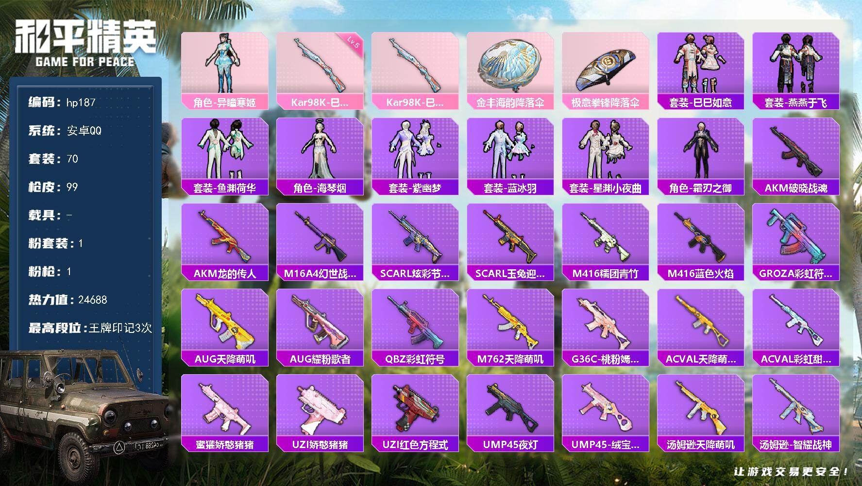 [16786780]安卓 手Q-1粉装-1特效枪-0载具-1粉色飞行器-24688热力值-3王牌印记-70套装-99枪皮 【粉色套装】:角色-异瞳寒姬 【粉色枪皮等级】:Kar98K-巳巳如意(五级) 【粉色枪皮】:Kar98K-巳巳如意 【粉色飞行器】:炫彩糖果飞行器 【粉色降落伞】:金丰海韵降落伞,极意拳锋降落伞,炫彩糖果降落伞 【稀有套装】:套装-巳巳如意,套装-炫彩糖果,套装-燕燕于飞,套装-鱼渊荷华,角色-海琴烟,套装-紫幽梦,套装-蓝冰羽,套装-星渊小夜曲,角色-霜刃之御 【稀有枪皮】:AKM-破晓战魂,AKM-龙的传人,M16A4-幻世战舞者,SCAR-L-炫彩节奏,SCAR-L-玉兔迎春,M416-糯团青竹,M416-蓝色火焰,GROZA-彩虹符号,AUG-天降萌叽,AUG-耀粉歌者,QBZ-彩虹符号,M762-天降萌叽,G36C-桃粉嫣然,AC-VAL-天降萌叽,AC-VAL-彩虹甜喵,蜜獾-娇憨猪猪,UZI-娇憨猪猪,UZI-红色方程式,UMP45-夜灯,UMP45-绒宝小鹅,汤姆逊-天降萌叽,汤姆逊-智耀战神,P90-巳巳如意,Kar98K-彩虹符号,M24-炫彩节奏,Mini14-炫彩节奏,SLR-娇憨猪猪,S686-巳巳如意,S1897-炫彩节奏,S12K-破晓战魂,S12K-娇憨猪猪,S12K-幻世战舞者,M249-彩虹符号,DP-28-彩虹符号,MG3-幻世战舞者,MG3-惊鸿侠骨,R45-幻彩电音,蝎式手枪-千金淑猫,战术弩-江南烟雨,破片手榴弹-巳巳如意 【其他套装】:套装-SS20特训,套装-SS21特训,套装-SS22特训,套装-SS25特训,套装-SS27特训,套装-SS28特训,套装-六六大吉,套装-冷焰舞者,套装-幻世保卫者,套装-幻世战舞者,套装-探宝勇士,套装-旭日情侣,套装-暗金炫舞,套装-海岛探路者,套装-牛气冲天,套装-牛气满满,套装-特战装甲,套装-特训学院,套装-玉兔迎春,套装-白熊同盟,套装-白色伏地魔,套装-竞技名士,套装-绮丽涂鸦,套装-绯格组合,套装-缤纷果语,套装-耀眼新星,套装-蓝彩潮人,套装-长空猛禽,套装-霓虹街区,套装-飞行日记,套装-魅力单车,套装-麻辣教官,套装-黑色伏地魔,套装-沙漠毒蛇,套装-蓝调潮人,套装-极地朋克,套装-冰川特警,套装-娇憨猪猪,套装-萌趣咩咩,套装-暖心橘喵,角色-情公主 【稀有