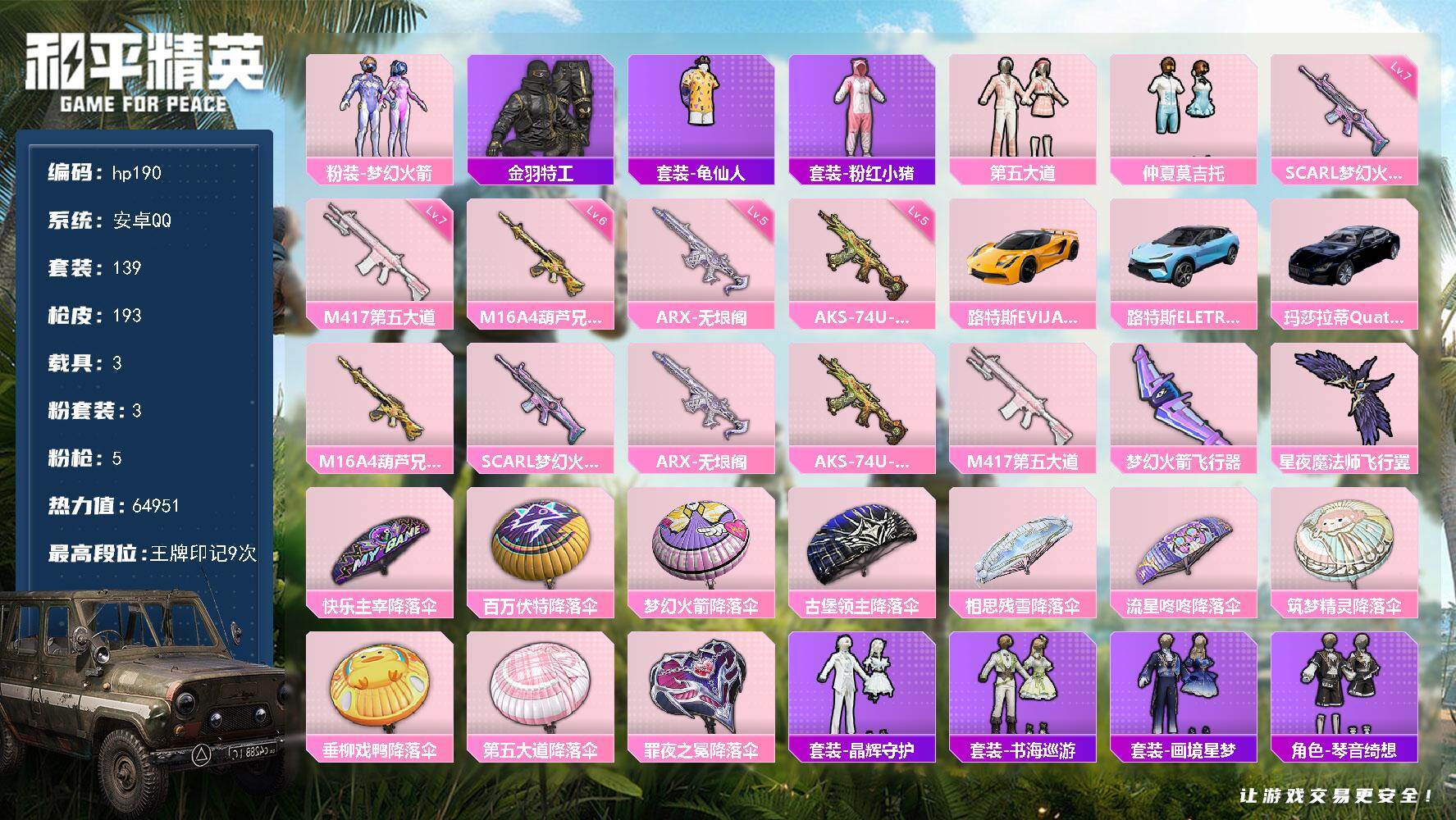 [16787006]安卓 手Q-3粉装-5特效枪-3载具-2粉色飞行器-64951热力值-9王牌印记-139套装-193枪皮 【热门品类】:粉装-梦幻火箭,套装-金羽特工,套装-龟仙人,套装-粉红小猪 【粉色套装】:粉装-梦幻火箭,粉装-第五大道,粉装-仲夏莫吉托 【粉色枪皮等级】:M16A4-葫芦兄弟(六级),SCAR-L-梦幻火箭(七级),ARX-无垠阁(五级),AKS-74U-森灵之息(五级),M417-第五大道(七级) 【粉色载具】:路特斯EVIJA(星际黄),路特斯ELETRE(冰川蓝),玛莎拉蒂Quattroporte(夜幕蓝) 【粉色枪皮】:M16A4-葫芦兄弟,SCAR-L-梦幻火箭,ARX-无垠阁,AKS-74U-森灵之息,M417-第五大道 【粉色飞行器】:梦幻火箭飞行器,星夜魔法师飞行翼 【粉色降落伞】:快乐主宰降落伞,百万伏特降落伞,梦幻火箭降落伞,古堡领主降落伞,相思残雪降落伞,流星咚咚降落伞,筑梦精灵降落伞,垂柳戏鸭降落伞,第五大道降落伞,罪夜之冕降落伞 【稀有套装】:套装-龟仙人,套装-雪国风尚,套装-晶辉守护,套装-书海巡游,套装-画境星梦,套装-琴音绮想,角色-月烬之祷,角色-杯旋调茶师 【稀有枪皮】:AKM-夜灯,AKM-奇异狩猎者,AKM-彩虹符号,AKM-灼热熔岩,AKM-破晓战魂,AKM-筑梦精灵,AKM-萌趣颜团子,AKM-虎虎生威,AKM-霓虹街区,AKM-龙的传人,M16A4-幻世战舞者,M16A4-甜心亚梦,SCAR-L-玉兔迎春,SCAR-L-红色方程式,SCAR-L-黄金龙骨,M416-夜灯,M416-糯团青竹,M416-红色方程式,M416-蓝色火焰,M416-黄金狮王,GROZA-异彩先驱,GROZA-彩虹符号,GROZA-治愈之星,GROZA-田园牧歌,GROZA-晶梦幻蝶,AUG-天降萌叽,AUG-耀粉歌者,AUG-青春冒险家,QBZ-彩虹符号,QBZ-飞驰魅影,M762-天降萌叽,M762-牛气冲天,M762-瑞龙福将,M762-第五大道,Mk47-妙红点点,Mk47-青春冒险家,G36C-不夜海上花,G36C-炙焰牛王,G36C-星穹咏叹调,AC-VAL-天降萌叽,AC-VAL-甜心亚梦,蜜獾-垂柳戏鸭,蜜獾-天降萌叽,蜜獾-娇憨猪猪,ACE32-画境星梦,UZI-众神之王,UZI-古堡领主,UZI-啾咪啾咪,UZI-