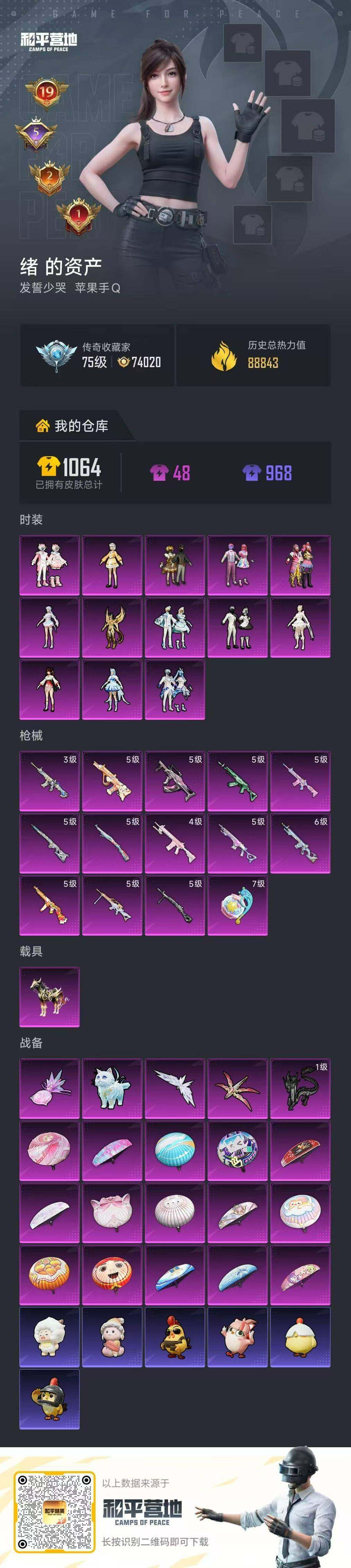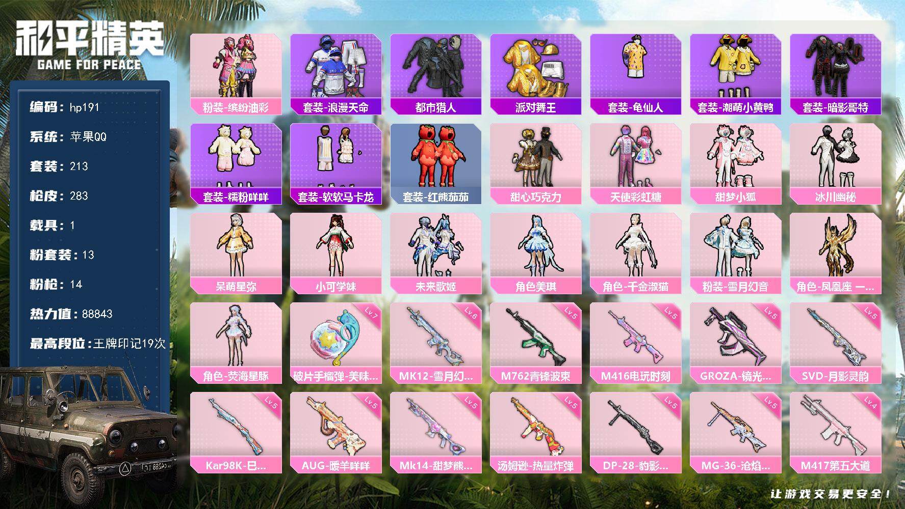 [16787055]苹果 手Q-13粉装-14特效枪-1载具-5粉色飞行器-88843热力值-19王牌印记-213套装-283枪皮