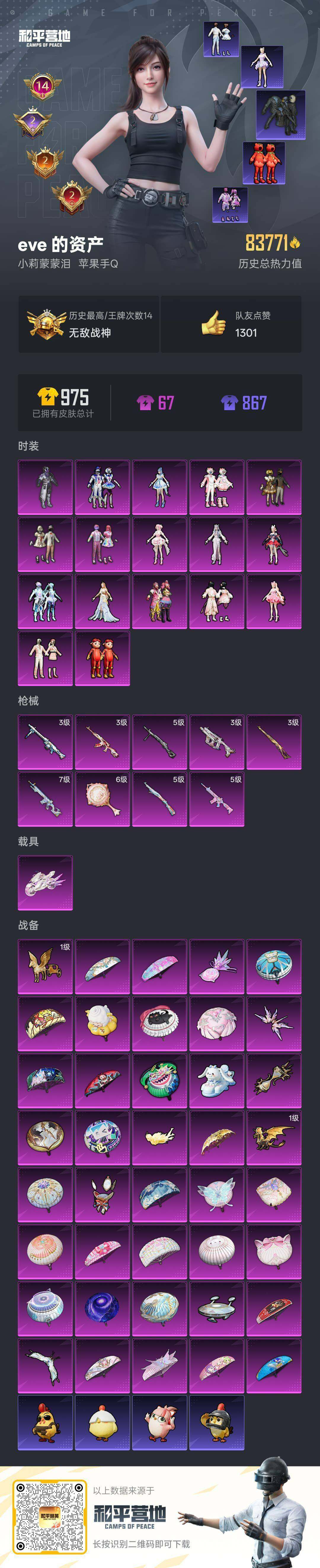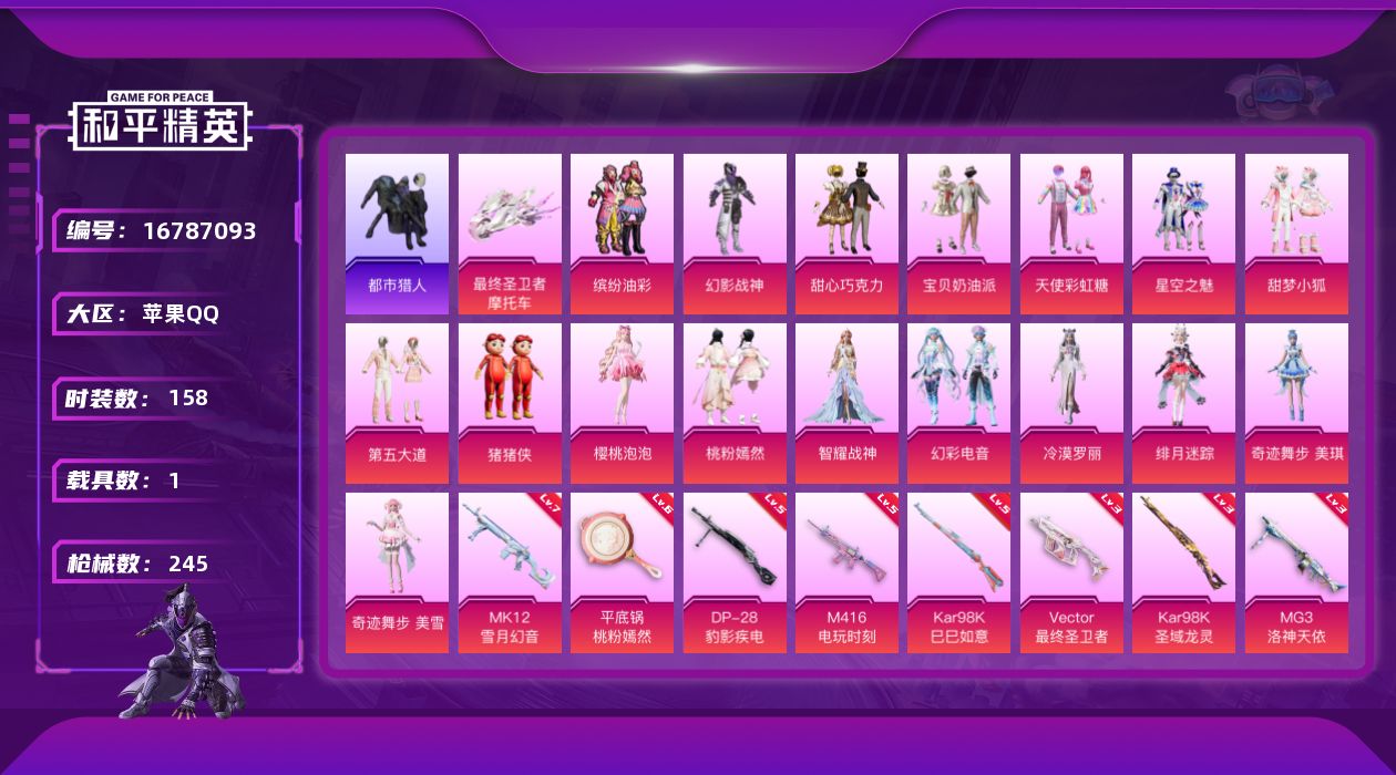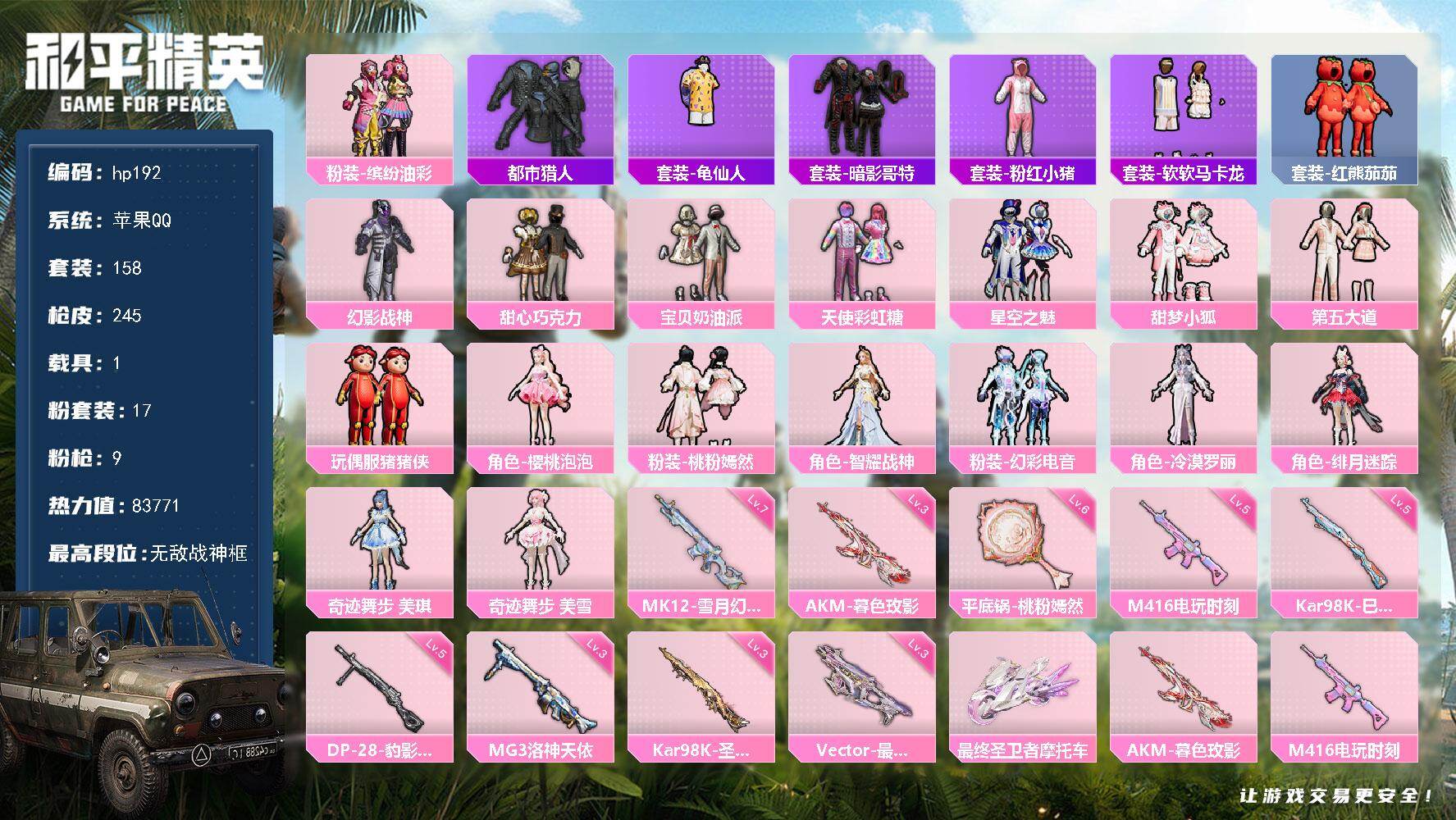 [16787093]苹果 手Q-无敌战神框-17粉装-9特效枪-1载具-10粉色飞行器-83771热力值-14王牌印记-158套装-245枪皮