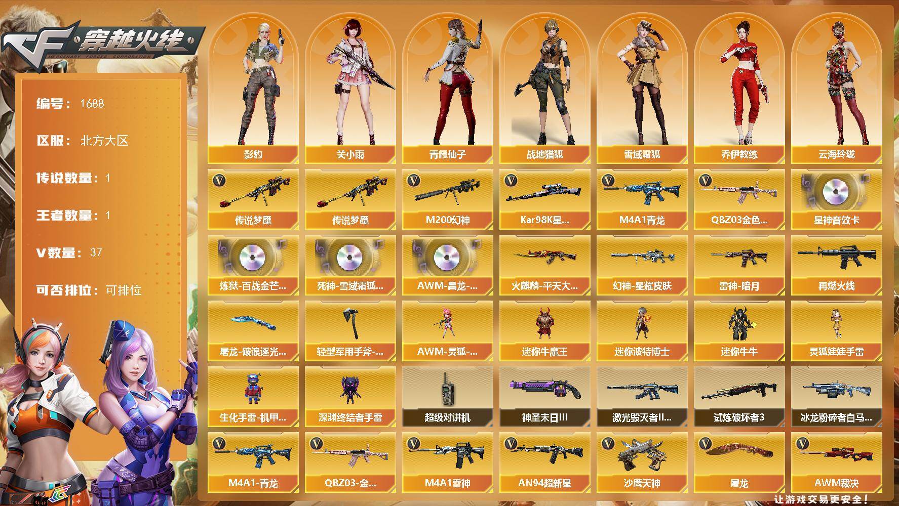 - [15707142]北京一区-37V-5王者-0炫金 【热门武器】:QBZ03-金色蔷薇,M200-幻神,修罗-古蛇迷踪,死亡之眼,沙鹰-修罗*3 【稀有皮肤】:雷神-赛博朋克,天龙-秘银,M200-庆典-CFS 2021*2,修罗-星空,屠龙-春桃 皮肤 【角色】:零,葵,隼,审判者,铁骑荣耀 【人偶武器】:AWM-灵狐-15周年嘉年华,夺魂,生化手雷-机甲核心 【暴走生化】:死亡之眼,超级对讲机 【挑战大师】:激光毁灭者III*3,激光毁灭者III-白马银枪 【英雄级武器】:高爆手雷-竞技荣光,烟雾弹-竞技荣光,闪光弹-竞技荣光*3,幻灵之锋,QBZ03-金色蔷薇,无影-神兵利器,M4A1-雷神,AWM-天龙,Barrett-毁灭,Barrett-极光,M200-幻神,M4A1-千变,黑武士-锦绣游龙,修罗-古蛇迷踪,沙鹰-修罗*3,擎天,屠龙,擎天-云海游龙