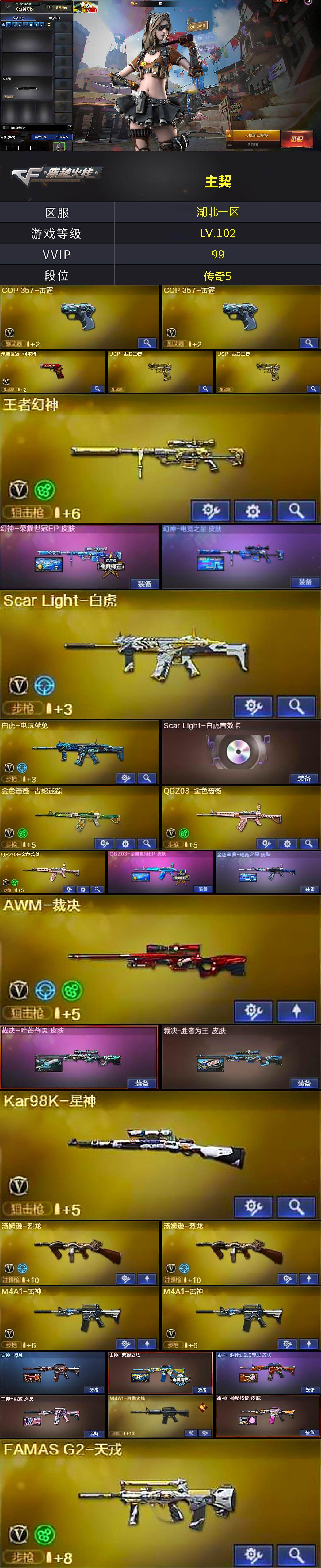 [16803325]湖北一区-97V-12王者武器数-4炫金武器数 【热门武器】:QBZ03-金色蔷薇*2,Scar Light-白虎,HK417-朱雀,金色蔷薇-古蛇迷踪,修罗-古蛇迷踪,死亡之眼,白虎-电玩蓝兔,荣耀世冠-柯尔特,Kar98K-星神,C.A.T,M4A1-黑骑士,汤姆逊-烈龙*2,加特林-炼狱,沙鹰-修罗*2 【王者炫金武器】:王者凤吟,炼狱-悦蓝,USP-雷暴王者*2,炫金毁灭,炫金修罗*3 【音效卡】:M4A1-黑骑士音效卡,Barrett-极光音效卡,Scar Light-白虎音效卡,Barrett-碧霄极光音效卡,炼狱-百战金芒-庆典舞曲音效卡 【皮肤】:幻神-荣耀世冠EP 皮肤,幻神-电竞之星 皮肤,QBZ03-荣耀世冠EP 皮肤,金色蔷薇-电竞之星 皮肤,裁决-叶芒苍灵 皮肤,裁决-胜者为王 皮肤,雷神-暗月,雷神-荣耀之魄,雷神-源计划2.0专属 皮肤,雷神-诺拉 皮肤,M4A1-再燃火线,雷神-神秘按键 皮肤,火麒麟-平天大圣,毁灭-暗月*2,毁灭-荣耀之怒,毁灭-英雄计划 皮肤,黑龙-能量核心,黑骑士-暗月,黑骑士-地狱火,无影-能量核心,战神-粉色甜心皮肤,战神-紫绶金章皮肤,AK47-B-常胜将军-曹操,修罗-能量核心,天神-暗月,屠龙-荣耀之锋*2,屠龙-巅峰荣耀 皮肤,龙啸-纸灯龙皮肤,轻型军用手斧-再燃火线 【角色】:葵,樱,炫,关小雨,战地猎狐,王者樱-热浪之夏,蛇隐宗,奇洋探员,乔伊教练,暗夜-X,初恋灵狐,芳心审判者,飞虎队-X,风暴女,虎妞,嘉年华灵狐,娟娟,兰-新年限定,兰妹妹,灵狐者-黄金海岸,麻雀,曼陀罗-X,曼陀罗-礼服,潘多拉-X,潘多拉-甜心教官,潜龙队-X,青霞仙子,蛇姬,铁骑荣耀,雪莉杨-摸金校尉,影武者-X,幽,游珑儿 【人偶武器】:巴雷特-零-水下丽影,AWM-灵狐-15周年嘉年华,C.A.T,生化手雷-机甲核心,深渊终结者手雷,迷你深渊冰龙-王绿豆,迷你超能女侍,迷你巨石泰坦-魔花研究所 【暴走生化】:死亡之眼,超级对讲机 【挑战大师】:神圣爆裂者III,AK47-冰龙粉碎者,激光毁灭者III,神圣爆裂者-末日III,阐释者III*2 【英雄级武器】:M4A1-黑龙,M4A1-雷神*2,M4A1-黑骑士,AK12-天启,M4A1-雷霆,HK417-朱雀,Scar Light-白虎,无影-神兵利器,黑武士-锦