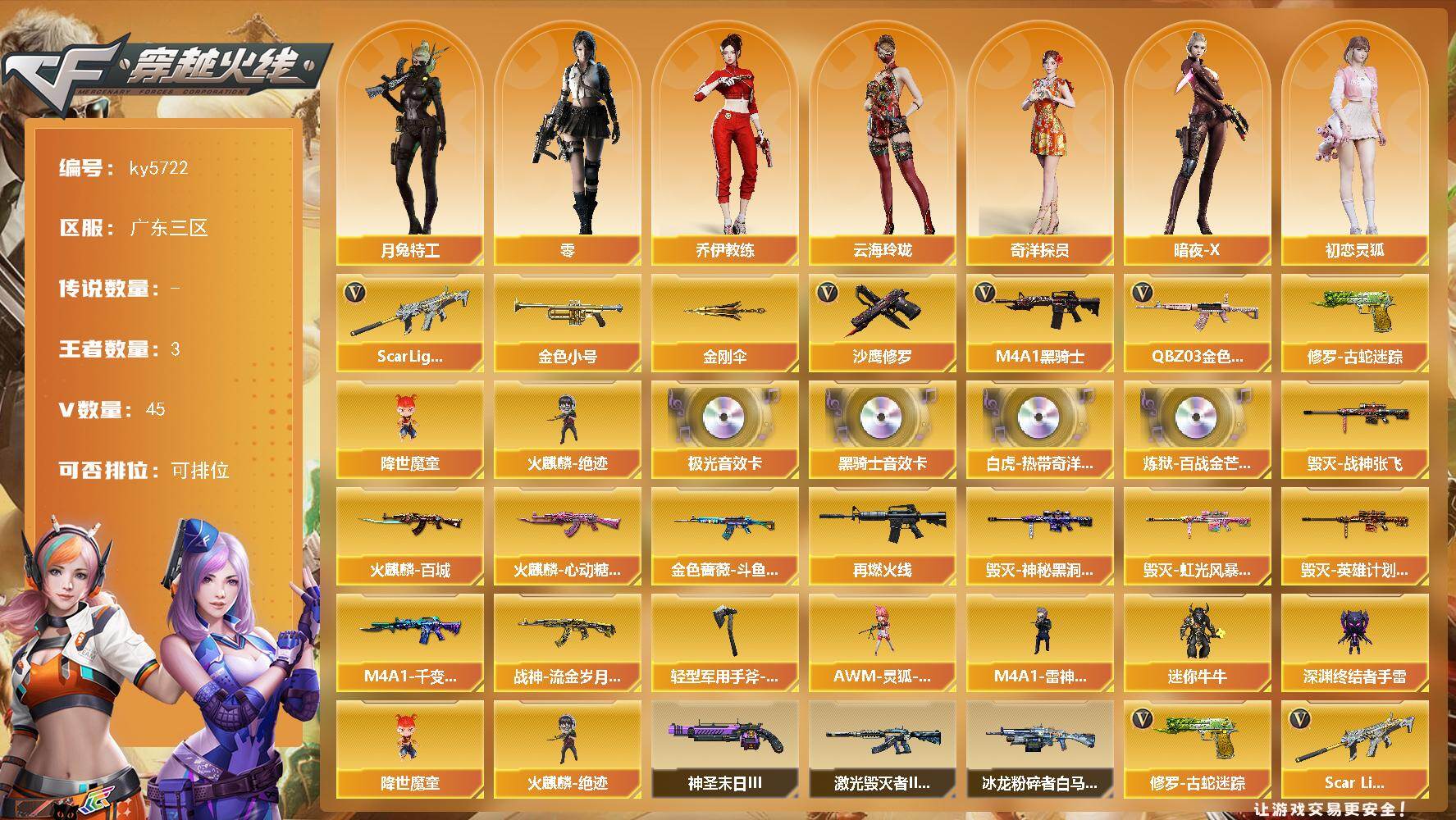 [16803622]广东三区-43V-3王者武器数-0炫金武器数 【热门武器】:QBZ03-金色蔷薇,Scar Light-白虎,修罗-古蛇迷踪,金色小号,M4A1-黑骑士,降世魔童,火麒麟-绝迹,沙鹰-修罗,金刚伞 【音效卡】:Scar Light-白虎-热带奇洋音效卡,M4A1-黑骑士音效卡,Barrett-极光音效卡,炼狱-百战金芒-庆典舞曲音效卡 【皮肤】:QBZ03-金色蔷薇-斗鱼皮肤,M4A1-再燃火线,火麒麟-百城,火麒麟-心动糖果,毁灭-战神张飞,毁灭-神秘黑洞皮肤,毁灭-虹光风暴 皮肤,毁灭-英雄计划 皮肤,M4A1-千变-孔明皮肤,战神-流金岁月皮肤,轻型军用手斧-再燃火线 【角色】:零,月兔特工,奇洋探员,乔伊教练,云海玲珑,暗夜-X,初恋灵狐,电竞少女,芳心审判者,飞虎队-X,风暴女,嘉年华灵狐,灵狐-花神,灵狐者-X,曼陀罗-礼服,潘多拉-X,斯沃特-X 【人偶武器】:火麒麟-绝迹,M4A1-雷神-精英刀锋,AWM-灵狐-15周年嘉年华,迷你牛牛*2,深渊终结者手雷,降世魔童 【挑战大师】:冰龙粉碎者-白马银枪,激光毁灭者III-白马银枪,神圣爆裂者-末日III 【英雄级武器】:M4A1-千变,AK47-火麒麟,M4A1-雷神*2,M4A1-黑骑士,Scar Light-白虎,无影-神兵利器,黑武士-锦绣游龙,超新星-热带奇洋,QBZ03-金色蔷薇,烈火-动感闪耀,QBZ-03-王者蔷薇-觉醒版,Barrett-毁灭,Barrett-极光,炼狱-百战金芒,烈龙-云海游龙,沙鹰-修罗,天神-动感闪耀,修罗-古蛇迷踪,唐刀-神工天巧,屠龙-动感闪耀,擎天-云海游龙,龙啸-热带奇洋,麒麟刺-百战金芒,屠龙-云海游龙,高爆手雷-竞技荣光*2,高爆手雷-神工天巧,手雷-动感闪耀,手雷-云海游龙,手雷-热带奇洋,高爆手雷-古蛇迷踪,闪光弹-竞技荣光,闪光弹-神工天巧,烟雾弹-竞技荣光,烟雾弹-神工天巧*2,烟雾弹-古蛇迷踪,烟雾弹-雷霆王者-觉醒版,M4A1-赤狱骑士 【道具】:AG战队炫彩背包,BS战队炫彩背包,CFS限定背包,EDG炫彩背包,云海游龙炫彩背包,亚洲杯纪念炫彩背包,全能枪王背包,古蛇迷踪炫彩背包,奇洋探员-海龟背包,战舰背包,热带奇洋炫彩背包,百战金芒炫彩背包,超级背包,女皇终结者-魔龙之吻,救世主-黑桃战神,绿色巨人,灵魂忍者*2,变异宝贝,迷雾幽灵