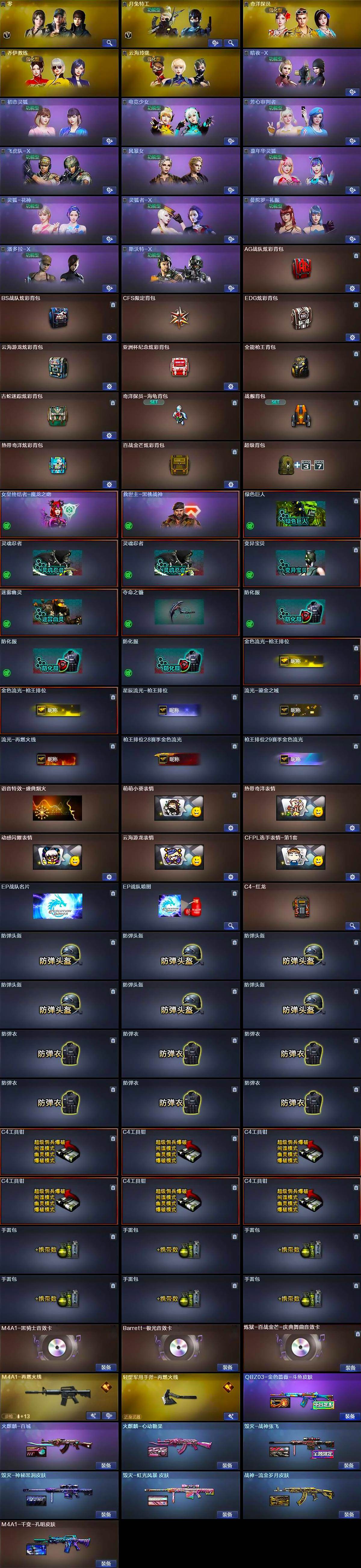【道具】:AG战队炫彩背包,BS战队炫彩背包,CFS限定背包,EDG炫彩背包,云海游龙炫彩背包,亚洲杯纪念炫彩背包,全能枪王背包,古蛇迷踪炫彩背包,奇洋探员-海龟背包,战舰背包,热带奇洋炫彩背包,百战金芒炫彩背包,超级背包,女皇终结者-魔龙之吻,救世主-黑桃战神,绿色巨人,灵魂忍者*2,变异宝贝,迷雾幽灵