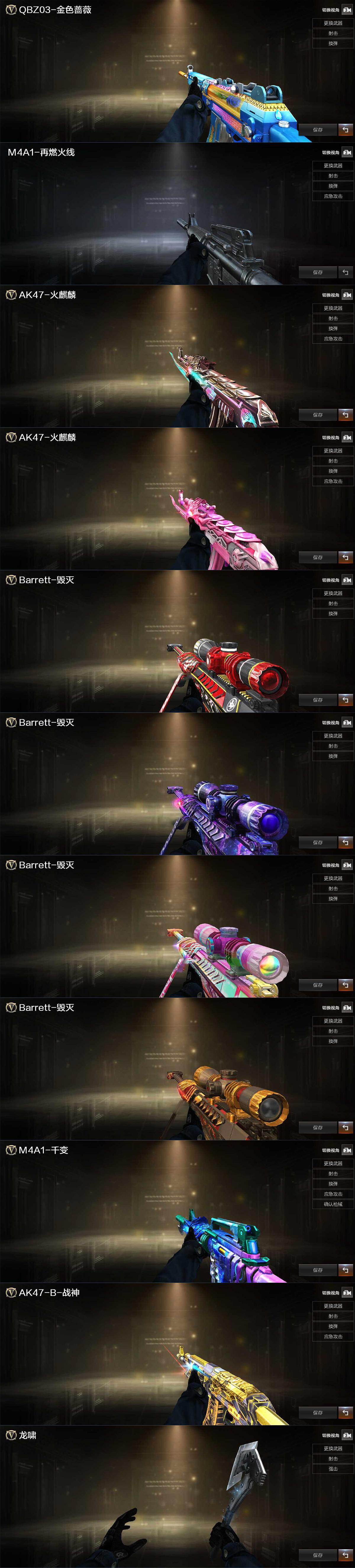 【英雄级武器】:M4A1-千变,AK47-火麒麟,M4A1-雷神*2,M4A1-黑骑士,Scar Light-白虎,无影-神兵利器,黑武士-锦绣游龙,超新星-热带奇洋,QBZ03-金色蔷薇,烈火-动感闪耀,QBZ-03-王者蔷薇-觉醒版,Barrett-毁灭,Barrett-极光,炼狱-百战金芒,烈龙-云海游龙,沙鹰-修罗,天神-动感闪耀,修罗-古蛇迷踪,唐刀-神工天巧,屠龙-动感闪耀,擎天-云海游龙,龙啸-热带奇洋,麒麟刺-百战金芒,屠龙-云海游龙,高爆手雷-竞技荣光*2,高爆手雷-神工天巧,手雷-动感闪耀,手雷-云海游龙,手雷-热带奇洋,高爆手雷-古蛇迷踪,闪光弹-竞技荣光,闪光弹-神工天巧,烟雾弹-竞技荣光,烟雾弹-神工天巧*2,烟雾弹-古蛇迷踪,烟雾弹-雷霆王者-觉醒版,M4A1-赤狱骑士
