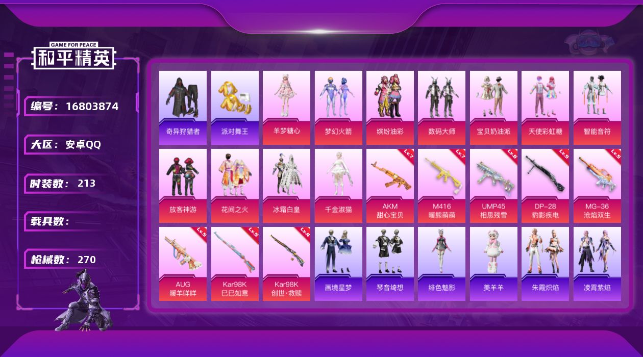 [16803874]安卓 手Q-11粉装-9特效枪-0载具-2粉色飞行器-86277热力值-12王牌印记-213套装-270枪皮