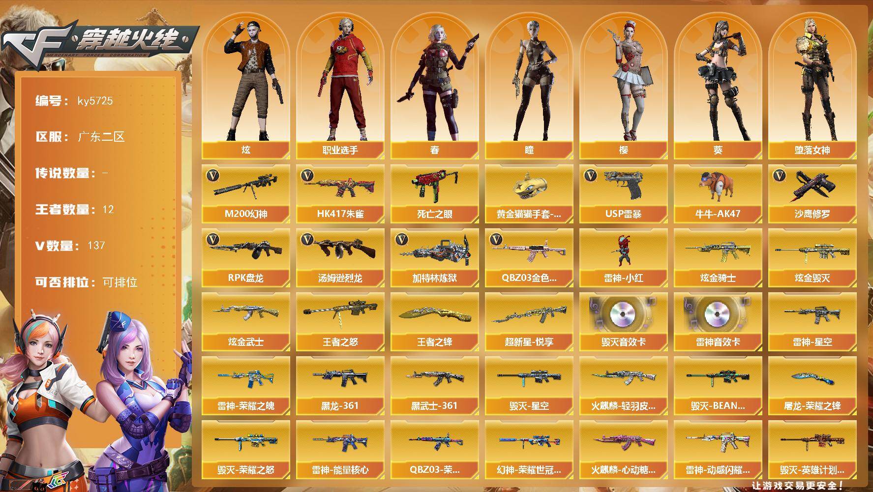 [16804222]广东二区-146V-12王者武器数-4炫金武器数 【热门武器】:QBZ03-金色蔷薇,HK417-朱雀,M200-幻神,死亡之眼*2,牛牛-AK47,汤姆逊-烈龙,RPK-盘龙*2,加特林-炼狱,雷神-小红,USP-雷暴,沙鹰-修罗*2,黄金猫猫手套-白鲨 【王者炫金武器】:超新星-悦享,王者之怒,王者之锋,炫金骑士,炫金武士,炫金毁灭*2 【音效卡】:M4A1-雷神音效卡,Barrett-毁灭音效卡 【皮肤】:M200-幻神-荣耀世冠白鲨,QBZ03-荣耀世冠白鲨,雷神-能量核心,雷神-荣耀之魄,雷神-星空,雷神-动感闪耀 皮肤,火麒麟-轻羽皮肤,火麒麟-心动糖果,毁灭-荣耀之怒,毁灭-星空,毁灭-BEAN-2020MVP,毁灭-英雄计划 皮肤,黑龙-能量核心,黑龙-暗月,M4A1-黑龙-361,无影-能量核心,AK47-黑武士-361,战神-粉色甜心皮肤,战神-紫绶金章皮肤*3,战神-流金岁月皮肤*3,极光-能量核心,修罗-能量核心*2,屠龙-荣耀之锋 【角色】:葵,樱,瞳,炫,春,战地猎狐,堕落女神,乔伊教练,云海玲珑,空,暗夜-X,北极狐-X,嘉年华灵狐,灵狐者-X,灵狐者-黄金海岸,麻雀,曼陀罗-X,潘多拉-X,潘多拉-甜心教官,斯沃特-X,蜀雪,影武者-X,职业选手 【人偶武器】:雷神-小红,AWM-灵狐-15周年嘉年华,COP-旗袍,牛牛-AK47,深渊终结者手雷,闪光弹-小乔 【暴走生化】:死亡之眼*2 【挑战大师】:神圣爆裂者III,冰龙粉碎者-白马银枪*2,VEPR-12-金魔,激光毁灭者III 【英雄级武器】:AK47-火麒麟*3,M4A1-黑龙*2,M4A1-雷神,AK47-无影,M4A1-死神,AK47-黑武士*2,AN94-超新星*2,M4A1-龙血*3,AK47-雷暴,HK417-朱雀,M4A1-夜魔,无影-神兵利器,黑武士-锦绣游龙,M4A1-玫瑰精灵,QBZ03-金色蔷薇,烈火-动感闪耀,王者之影-觉醒版,王者之魄-觉醒版,王者之势-觉醒版,王者之戮-觉醒版,超新星-悦享-觉醒版,AK-47-猩红传说*5,AK47-B-战神,王者芳薇-觉醒版,Barrett-毁灭*3,AWM-裁决*2,M200-幻神,Barrett-金色蔷薇,王者之力-觉醒版,RPK-盘龙*2,加特林-炼狱,汤姆逊-烈龙,烈龙-云海游龙,AA-12-雷霆,沙鹰-