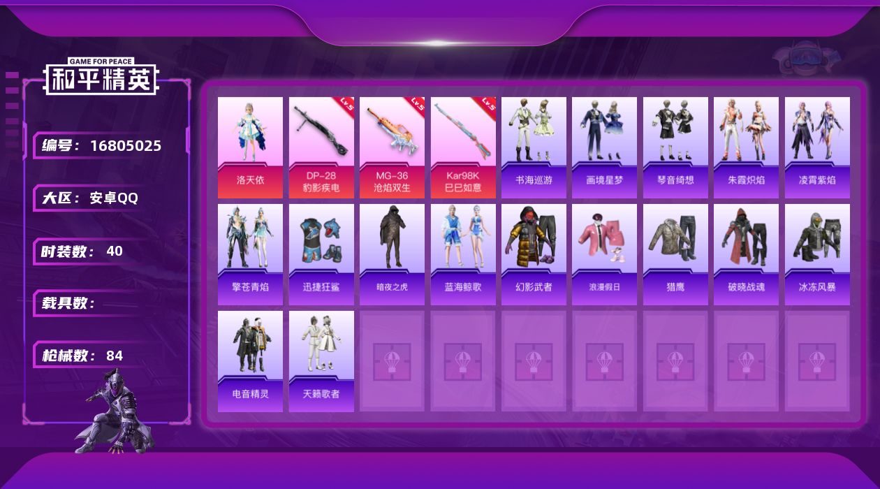 [16805025]安卓 手Q-1粉装-3特效枪-0载具-1粉色飞行器-20770热力值-1王牌印记-40套装-84枪皮 【热门品类】:套装-暗夜之虎 【粉色套装】:角色-洛天依 【粉色枪皮等级】:Kar98K-巳巳如意(五级),DP-28-豹影疾电(五级),MG-36-沧焰双生(五级) 【粉色枪皮】:Kar98K-巳巳如意,DP-28-豹影疾电,MG-36-沧焰双生 【粉色飞行器】:炫彩糖果飞行器 【粉色降落伞】:洛神天依降落伞,沙丘之主降落伞,极意拳锋降落伞,炫彩糖果降落伞 【稀有套装】:套装-炫彩糖果,套装-蓝海鲸歌,套装-朱霞炽焰,套装-凌霄紫焰,套装-擎苍青焰,套装-书海巡游,套装-画境星梦,套装-琴音绮想,套装-雨过天青,套装-红釉青花 【稀有枪皮】:M416-红色方程式,GROZA-影袭,AUG-耀粉歌者,QBZ-洛神天依,M762-天降萌叽,Mk47-洛神天依,AC-VAL-天降萌叽,ACE32-画境星梦,ARX-凌霄紫焰,UZI-天降萌叽,UZI-影袭,UMP45-夜灯,MP5K-画境星梦,JS9-凌霄紫焰,P90-巳巳如意,Kar98K-洛神天依,M24-影袭,M24-炫彩节奏,AMR-喜羊羊与灰太狼,M1加兰德-画境星梦,S12K-破晓战魂,DBS-幻彩电音,AA12-G-画境星梦,MG3-幻世战舞者,MG-36-凌霄紫焰,P92-凌霄紫焰,R45-幻彩电音,撬棍-沙丘之主权杖,平底锅-凌霄紫焰,平底锅-画境星梦 【其他套装】:套装-幻影武者,套装-浪漫假日,套装-猎鹰,套装-破晓战魂,套装-冰冻风暴,套装-迅捷狂鲨,套装-暗夜之虎,套装-电音精灵,套装-天籁歌者 【营地ID】:969846715