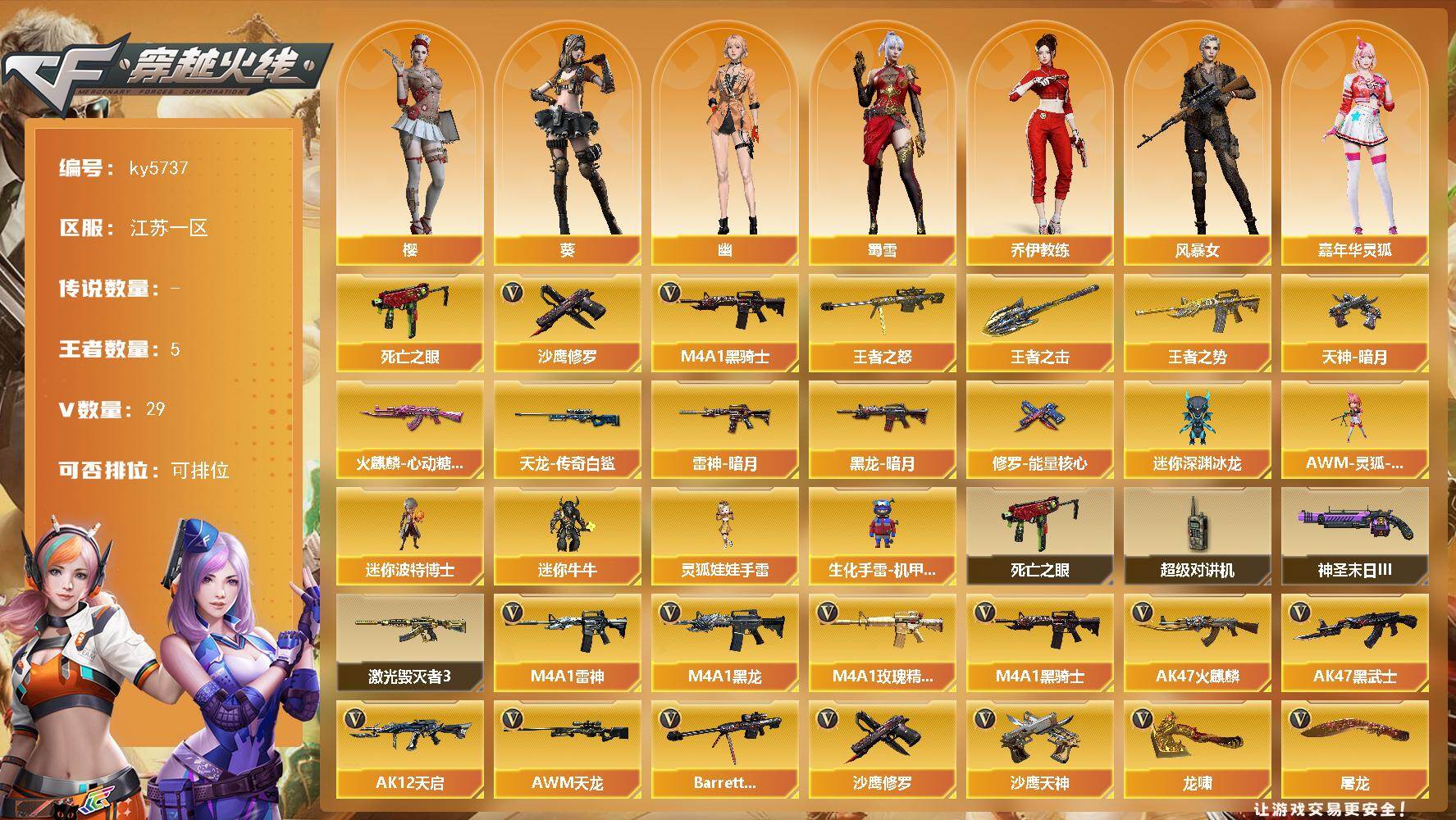 [16805814]江苏一区-30V-5王者武器数-0炫金武器数 【热门武器】:死亡之眼,M4A1-黑骑士,沙鹰-修罗 【王者炫金武器】:王者之势,王者之怒,王者之击 【皮肤】:雷神-暗月,火麒麟-心动糖果,黑龙-暗月*2,AWM-天龙-传奇白鲨,修罗-能量核心,天神-暗月 【角色】:葵,樱,乔伊教练,风暴女,嘉年华灵狐,灵狐者-黄金海岸,麻雀,潘多拉-X,斯沃特-X,蜀雪,影武者-X,幽 【人偶武器】:AWM-灵狐-15周年嘉年华,迷你深渊冰龙*2,迷你波特博士,迷你牛牛,生化手雷-机甲核心,灵狐娃娃手雷 【暴走生化】:死亡之眼,超级对讲机 【挑战大师】:激光毁灭者III,神圣爆裂者-末日III 【英雄级武器】:M4A1-千变,AK47-火麒麟*2,M4A1-黑龙,M4A1-雷神,M4A1-黑骑士,AK47-黑武士,AK12-天启,M4A1-龙血,无影-神兵利器,M4A1-玫瑰精灵,烈火-动感闪耀,AWM-天龙*2,Barrett-毁灭*3,AWM-裁决,沙鹰-修罗,沙鹰-天神,天神-动感闪耀,屠龙,龙啸,麒麟刺,屠龙-动感闪耀,手雷-动感闪耀,手雷-云海游龙,烟雾弹-雷霆王者-觉醒版 【道具】:CFS限定背包,战舰背包,炫彩背包,背包-洛丽塔,绿色巨人,灵魂忍者,变异宝贝,迷雾幽灵,夺命之镰,防化服*2,金色流光-枪王排位,星辰流光-枪王排位,枪王排位28赛季金色流光,枪王排位29赛季金色流光,动感闪耀表情,EP战队名片,EP战队喷图,C4-红龙,防弹头盔*6,防弹衣*6,C4工具钳*7,手雷包*6 【特殊枪械】:1黑骑士
