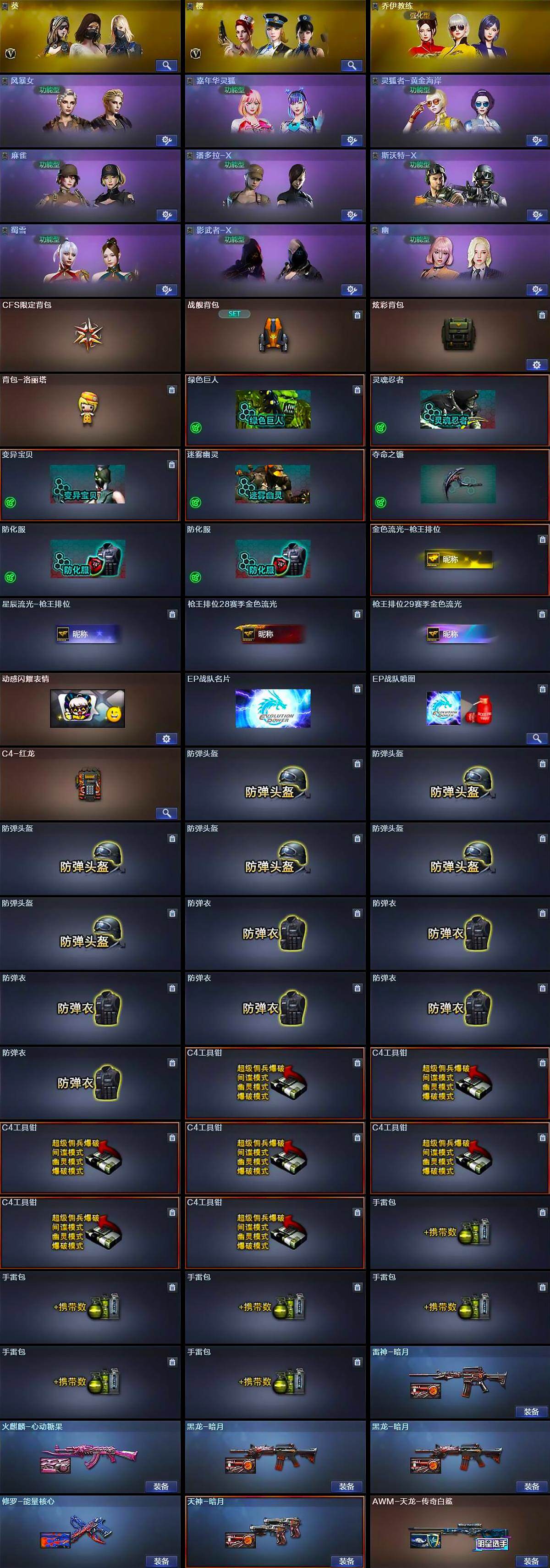【道具】:CFS限定背包,战舰背包,炫彩背包,背包-洛丽塔,绿色巨人,灵魂忍者,变异宝贝,迷雾幽灵,夺命之镰,防化服*2,金色流光-枪王排位,星辰流光-枪王排位,枪王排位28赛季金色流光,枪王排位29赛季金色流光,动感闪耀表情,EP战队名片,EP战队喷图,C4-红龙,防弹头盔*6,防弹衣*6,C4工具钳*7,手雷包*6