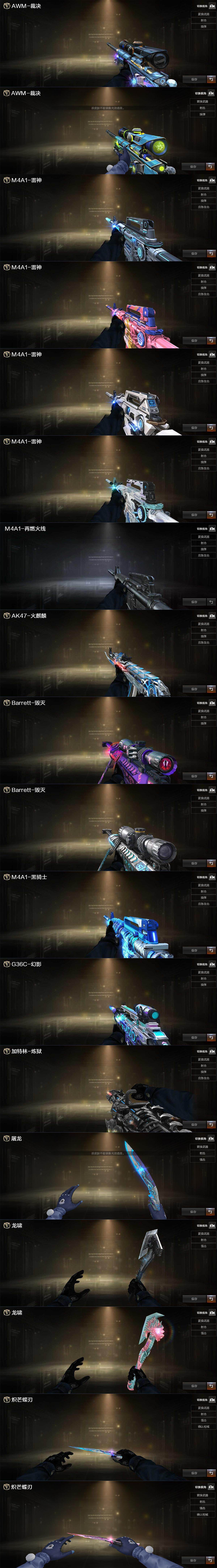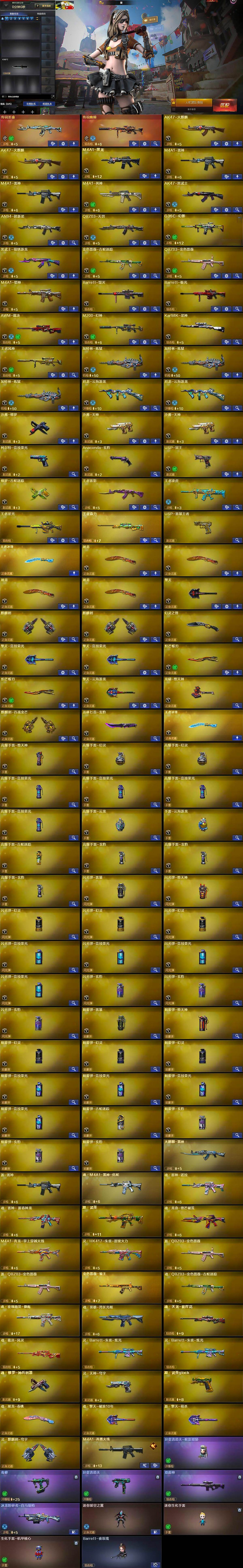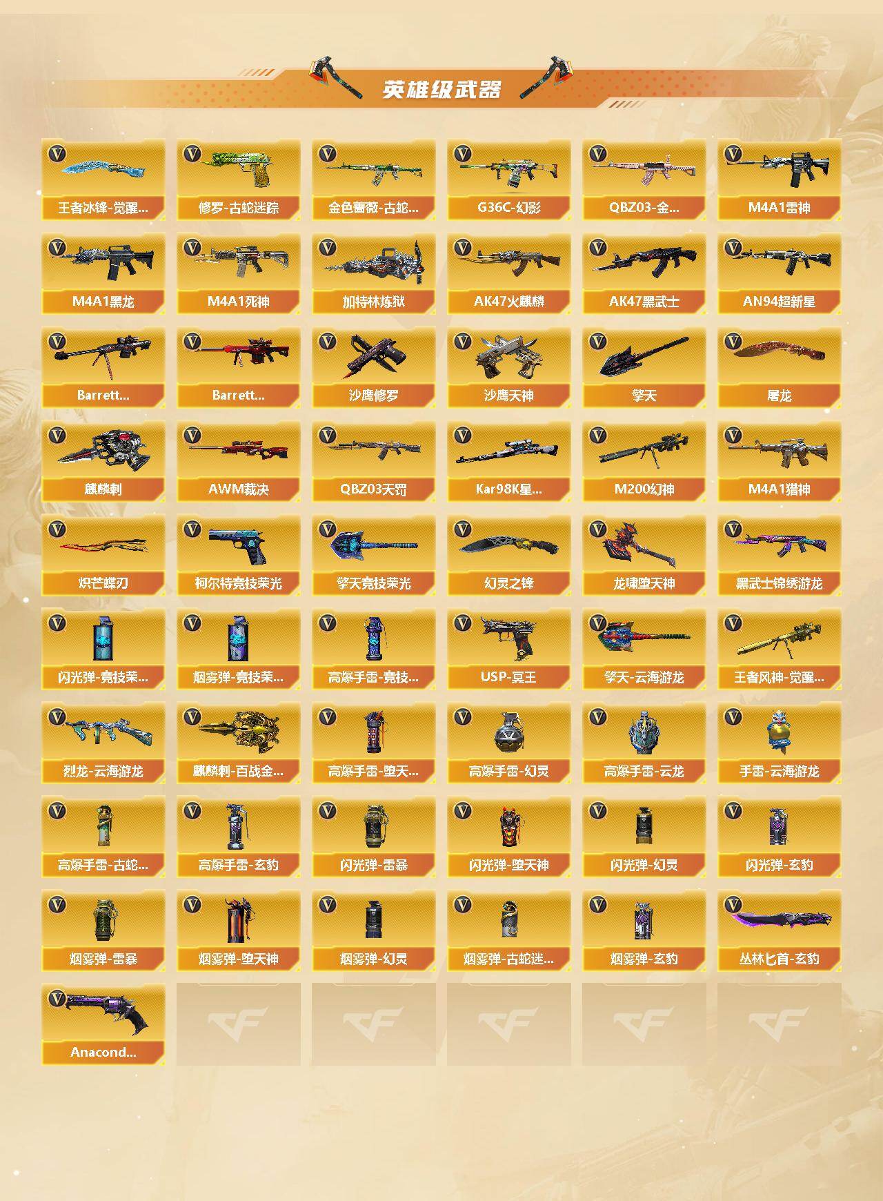 【英雄级武器】:AK47-火麒麟*2,M4A1-黑龙,M4A1-雷神*2,M4A1-死神,AK47-黑武士,AN94-超新星,QBZ03-天罚,G36C-幻影,黑武士-锦绣游龙,金色蔷薇-古蛇迷踪,QBZ03-金色蔷薇,M4A1-猎神,Barrett-毁灭,Barrett-极光,AWM-裁决,M200-幻神,Kar98K-星神,王者风神-觉醒版,加特林-炼狱*3,烈龙-云海游龙*2,沙鹰-修罗,沙鹰-天神*2,柯尔特-竞技荣光,Anaconda-玄豹,USP-冥王,修罗-古蛇迷踪,屠龙*4,擎天,麒麟刺*2,幻灵之锋,擎天-竞技荣光*2,炽芒蝶刃*2,擎天-云海游龙,龙啸-堕天神,麒麟刺-百战金芒,丛林匕首-玄豹,王者冰锋-觉醒版,高爆手雷-堕天神,高爆手雷-幻灵*2,高爆手雷-竞技荣光*4,高爆手雷-云龙,手雷-云海