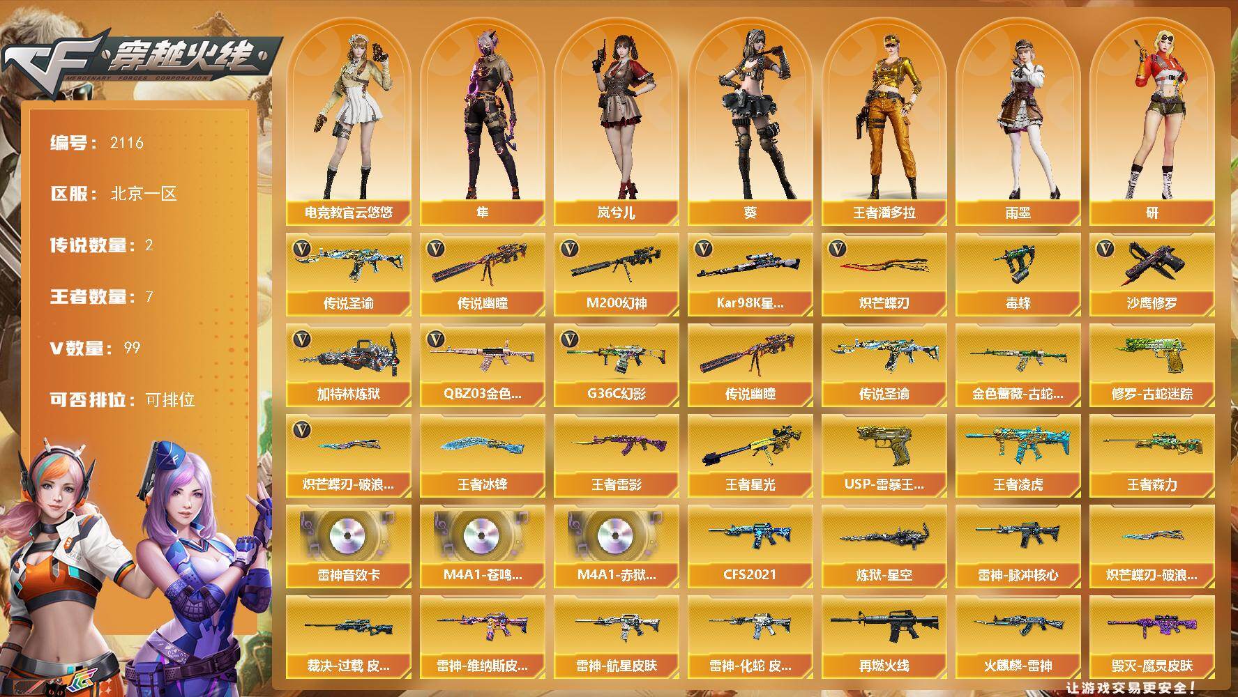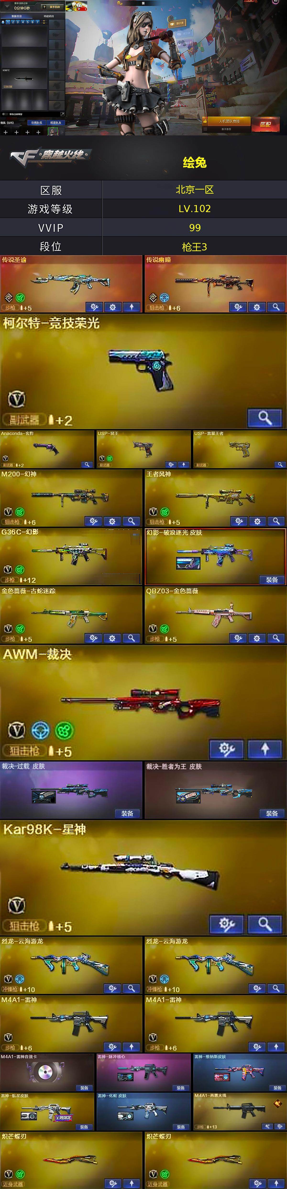 [16806310]北京一区-101V-7王者武器数-0炫金武器数 【传说武器】:传说圣谕,传说幽瞳 【热门武器】:传说幽瞳,传说圣谕,G36C-幻影,QBZ03-金色蔷薇,M200-幻神,金色蔷薇-古蛇迷踪,修罗-古蛇迷踪,Kar98K-星神,毒蜂,加特林-炼狱*3,沙鹰-修罗,炽芒蝶刃*2,炽芒蝶刃-破浪逐光 皮肤 【王者炫金武器】:王者雷影,王者凌虎,王者星光,王者森力,USP-雷暴王者,王者冰锋 【音效卡】:M4A1-雷神音效卡,M4A1-苍鸣雷神音效卡,M4A1-赤狱骑士-怀旧音效卡 【皮肤】:裁决-过载 皮肤,裁决-胜者为王 皮肤,雷神-脉冲核心,雷神-维纳斯皮肤,雷神-航星皮肤,雷神-化蛇 皮肤,M4A1-再燃火线,火麒麟-雷神,毁灭-魔灵皮肤,毁灭-航天科技皮肤,黑骑士-CFS2021,幻影-破浪逐光 皮肤,炼狱-星空,屠龙-破浪逐光 皮肤,轻型军用手斧-再燃火线,龙啸-青青莓果 皮肤,炽芒蝶刃-破浪逐光 皮肤,炽芒蝶刃-宋雨琦 皮肤 【角色】:葵,电竞教官-云悠悠,岚兮儿,隼,雨墨,研,毒蝰术士,玄豹,荆棘,王者潘多拉,蛇隐宗,云海玲珑,北极狐-X,娟娟,兰-空鹰,兰-新年限定,0号玩家,灵狐者-X,曼陀罗-X,玫瑰花神,潘多拉-甜心教官,蛇姬,铁骑荣耀,影武者-X,幽 【人偶武器】:异变清道夫-蛇影双骄,迷你裂空之翼,迷你生化手雷,生化手雷-机甲核心,Barrett-夜玫瑰 【暴走生化】:毒蜂,异变清道夫,双面神 【挑战大师】:冰龙粉碎者-白马银枪 【英雄级武器】:AK47-火麒麟*2,M4A1-黑龙,M4A1-雷神*2,M4A1-死神,AK47-黑武士,AN94-超新星,QBZ03-天罚,G36C-幻影,黑武士-锦绣游龙,金色蔷薇-古蛇迷踪,QBZ03-金色蔷薇,M4A1-猎神,Barrett-毁灭,Barrett-极光,AWM-裁决,M200-幻神,Kar98K-星神,王者风神-觉醒版,加特林-炼狱*3,烈龙-云海游龙*2,沙鹰-修罗,沙鹰-天神*2,柯尔特-竞技荣光,Anaconda-玄豹,USP-冥王,修罗-古蛇迷踪,屠龙*4,擎天,麒麟刺*2,幻灵之锋,擎天-竞技荣光*2,炽芒蝶刃*2,擎天-云海游龙,龙啸-堕天神,麒麟刺-百战金芒,丛林匕首-玄豹,王者冰锋-觉醒版,高爆手雷-堕天神,高爆手雷-幻灵*2,高爆手雷-竞技荣光*4,高爆手雷-云龙,手雷-云海