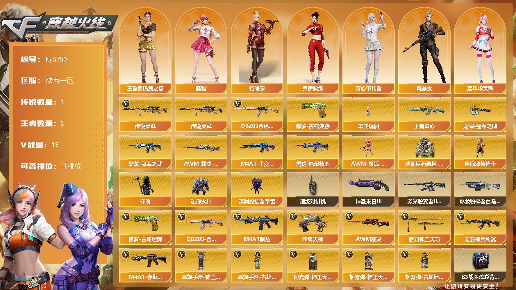 [16807570]陕西一区-17V-2王者武器数-0炫金武器数 【传说武器】:传说灵眸 【热门武器】:传说灵眸,QBZ03-金色蔷薇,修罗-古蛇迷踪,羊驼玩偶 【王者炫金武器】:王者霜心 【皮肤】:AWM-裁决-百城联赛天津皮肤,M4A1-千变-孔明皮肤,黑龙-能量核心,黑龙-冠军之武,龙啸-冠军之啸 【角色】:晴雅,王者樱-热浪之夏,蛇隐宗,乔伊教练,芳心审判者,风暴女,嘉年华灵狐,娟娟,灵狐者-X,麻雀,潘多拉-X,潘多拉-甜心教官,蛇姬,兔囡囡 【人偶武器】:AWM-灵狐-15周年嘉年华,迷你波特博士,夺魂,迷你火种,深渊终结者手雷*2,迷你巨石泰坦-魔花研究所 【暴走生化】:超级对讲机 【挑战大师】:冰龙粉碎者-白马银枪,激光毁灭者III-白马银枪,神圣爆裂者-末日III 【英雄级武器】:M4A1-黑龙,无影-神兵利器,QBZ03-金色蔷薇,AWM-裁决,沙鹰-天神,修罗-古蛇迷踪,唐刀-神工天巧,高爆手雷-神工天巧*2,高爆手雷-古蛇迷踪,闪光弹-神工天巧,烟雾弹-神工天巧,烟雾弹-古蛇迷踪,M4A1-赤狱骑士 【道具】:BS战队炫彩背包,云山科技背包,亚洲杯纪念炫彩背包,全能枪王背包,古蛇迷踪炫彩背包,次元之矛-黄金背包,老虎背包,超级背包,女皇终结者-魔龙之吻,救世主-黑桃战神,绿色巨人,灵魂忍者,迷雾幽灵,生化弹匣,夺命之镰,防化服*3,金色流光-枪王排位*2,星辰流光-枪王排位,枪王排位28赛季金色流光,枪王排位29赛季金色流光,古蛇迷踪打击特效,蛇隐宗表情,动感闪耀表情,防弹头盔*8,防弹衣*8,C4工具钳*8,手雷包*9 【特殊枪械】: