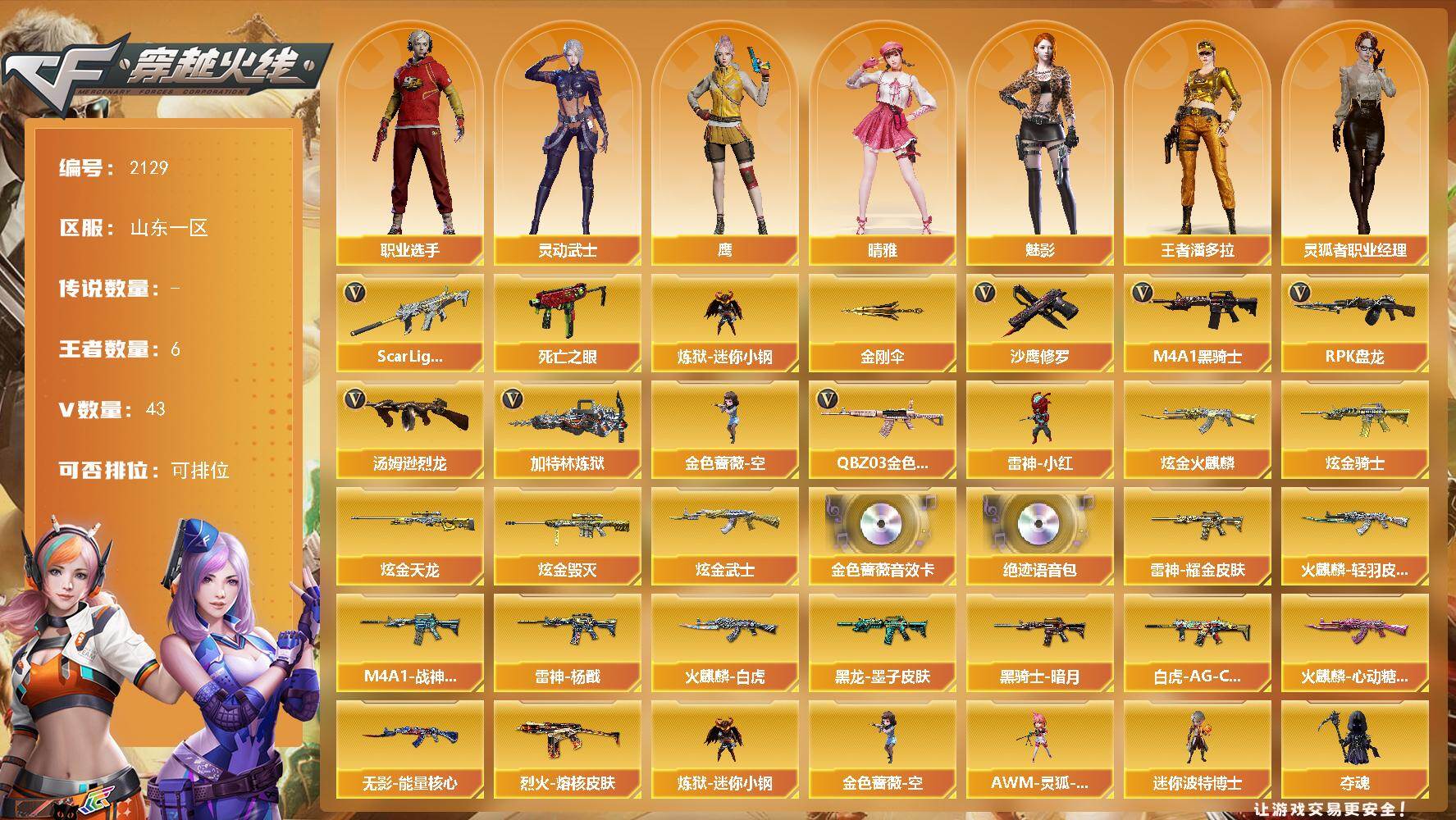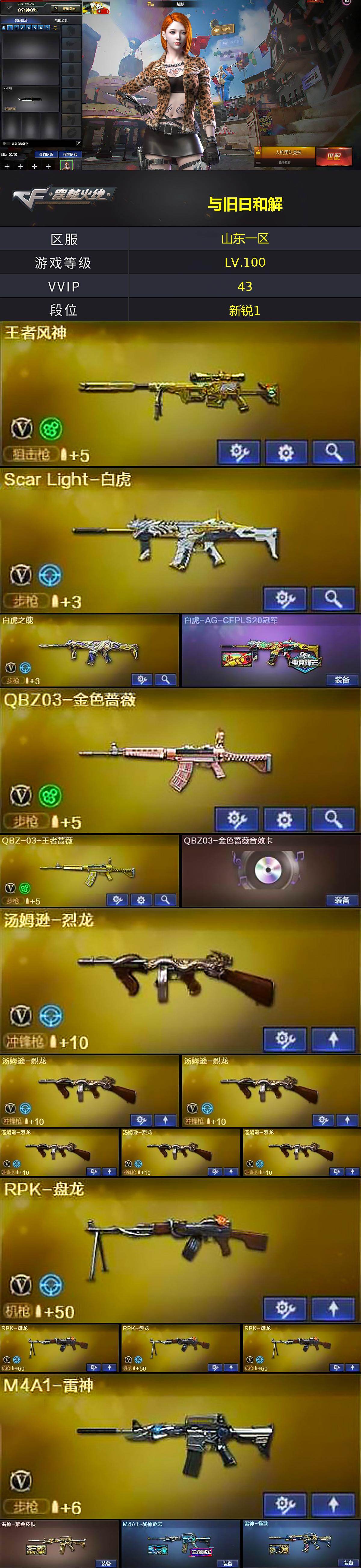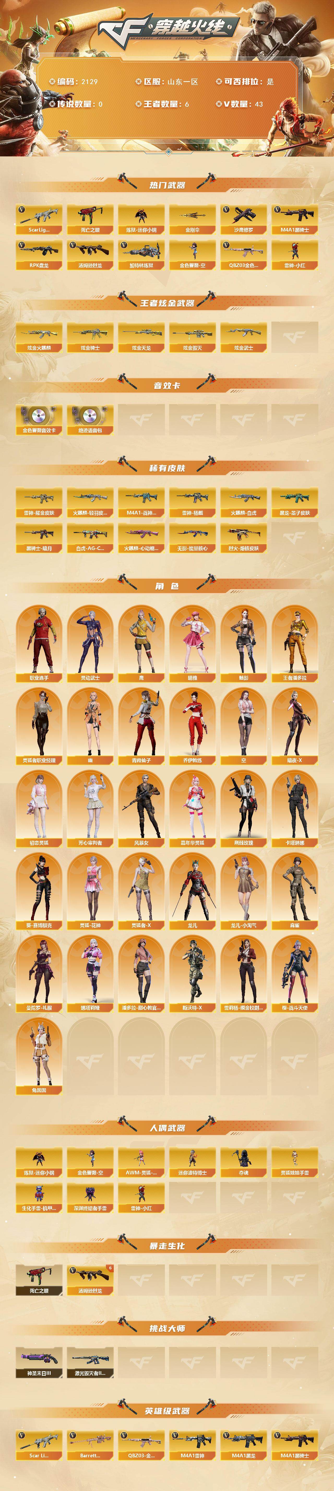 [16807930]山东一区-49V-6王者武器数-5炫金武器数 【热门武器】:QBZ03-金色蔷薇,Scar Light-白虎,死亡之眼,炼狱-迷你小钢,M4A1-黑骑士,汤姆逊-烈龙*6,RPK-盘龙*4,加特林-炼狱,金色蔷薇-空,雷神-小红,沙鹰-修罗*2,金刚伞 【王者炫金武器】:炫金火麒麟,炫金骑士,炫金武士,炫金毁灭,炫金天龙 【音效卡】:QBZ03-金色蔷薇音效卡,绝迹语音包 【皮肤】:白虎-AG-CFPLS20冠军,雷神-耀金皮肤,M4A1-战神赵云,雷神-杨戬,火麒麟-轻羽皮肤,火麒麟-白虎,火麒麟-心动糖果,黑龙-墨子皮肤,黑骑士-暗月,无影-能量核心,烈火-熔核皮肤 【角色】:魅影,鹰,晴雅,王者潘多拉,乔伊教练,空,暗夜-X,初恋灵狐,芳心审判者,风暴女,嘉年华灵狐,荆棘玫瑰,卡塔琳娜,葵-赛博朋克,灵动武士,灵狐-花神,灵狐者-X,灵狐者-职业经理,龙儿,龙儿-小淘气,麻雀,曼陀罗-礼服,娜塔莉娅,潘多拉-甜心教官,青霞仙子,斯沃特-X,兔囡囡,雪莉杨-摸金校尉,樱-战斗天使,幽,职业选手 【人偶武器】:雷神-小红,炼狱-迷你小钢,金色蔷薇-空,AWM-灵狐-15周年嘉年华,迷你波特博士,夺魂*2,生化手雷-机甲核心,深渊终结者手雷,灵狐娃娃手雷 【暴走生化】:死亡之眼 【挑战大师】:激光毁灭者III-白马银枪*2,神圣爆裂者-末日III 【英雄级武器】:M4A1-千变,AK47-火麒麟*2,AK47-麒麟,M4A1-黑龙,M4A1-雷神,M4A1-黑骑士,M4A1-死神,AK47-黑武士,AN94-超新星,M4A1-武圣,Scar Light-白虎,无影-神兵利器,QBZ03-金色蔷薇,王者之心-觉醒版,王者之势-觉醒版,QBZ-03-王者蔷薇-觉醒版,白虎之魄-觉醒版,Barrett-毁灭,Barrett-金色蔷薇,王者风神-觉醒版,RPK-盘龙*4,加特林-炼狱,汤姆逊-烈龙*6,AA-12-雷霆,沙鹰-修罗*2,Glock18-武圣,天神-动感闪耀,屠龙,麒麟刺,王者之刺-觉醒版,高爆手雷-幻灵,手雷-动感闪耀,闪光弹-幻灵,烟雾弹-幻灵 【道具】:全能枪王背包,夺命之镰,防化服*2,金色流光-枪王排位*2,星辰流光-枪王排位,防弹头盔,防弹衣,C4工具钳,手雷包 【特殊枪械】:1白虎,1黑骑士,6烈龙,4盘龙,1炼狱