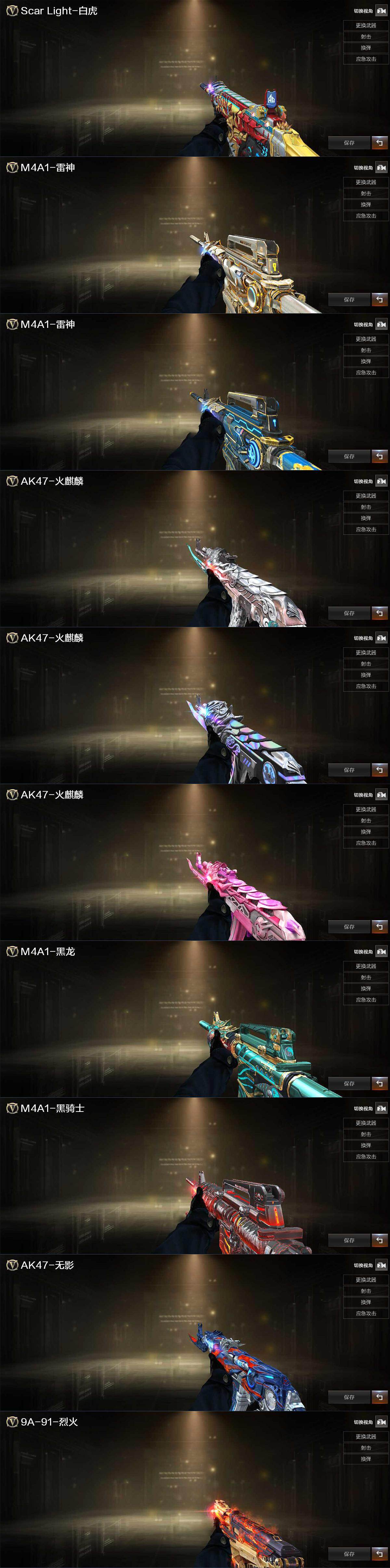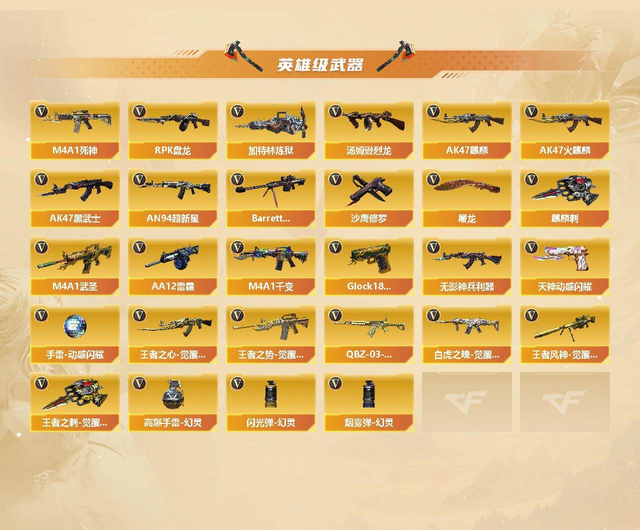 【英雄级武器】:M4A1-千变,AK47-火麒麟*2,AK47-麒麟,M4A1-黑龙,M4A1-雷神,M4A1-黑骑士,M4A1-死神,AK47-黑武士,AN94-超新星,M4A1-武圣,Scar Light-白虎,无影-神兵利器,QBZ03-金色蔷薇,王者之心-觉醒版,王者之势-觉醒版,QBZ-03-王者蔷薇-觉醒版,白虎之魄-觉醒版,Barrett-毁灭,Barrett-金色蔷薇,王者风神-觉醒版,RPK-盘龙*4,加特林-炼狱,汤姆逊-烈龙*6,AA-12-雷霆,沙鹰-修罗*2,Glock18-武圣,天神-动感闪耀,屠龙,麒麟刺,王者之刺-觉醒版,高爆手雷-幻灵,手雷-动感闪耀,闪光弹-幻灵,烟雾弹-幻灵