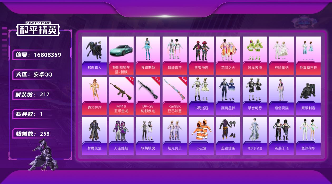 [16808359]安卓 手Q-8粉装-4特效枪-1载具-2粉色飞行器-78984热力值-14王牌印记-217套装-258枪皮 【热门品类】:套装-都市猎人,套装-小丑鱼,套装-忍者信条,旭日初心兜帽大衣 【粉色套装】:粉装-智能音符,粉装-放客神游,粉装-花间之火,粉装-恐龙拽拽,粉装-纯珍童话,粉装-仲夏莫吉托,角色-羲和光序,角色-异瞳寒姬 【粉色枪皮等级】:M416-五爪金龙(七级),Kar98K-巳巳如意(五级),DP-28-豹影疾电(五级) 【粉色载具】:特斯拉Roadster(水滴蓝) 【粉色枪皮】:M416-五爪金龙,Kar98K-巳巳如意,Mk14-福马献瑞,DP-28-豹影疾电 【粉色飞行器】:炫彩糖果飞行器,沙丘之主天马 【粉色降落伞】:深海曼妙降落伞,绝对恒星降落伞,神秘黑猫降落伞,四圣焕新降落伞,花间之火降落伞,王牌四分卫降落伞,旋转彩虹降落伞,莲影清波降落伞,墨龙九天降落伞,星梦奇缘降落伞,临安公主降落伞,雪月幻音降落伞,智耀战神降落伞,幻彩电音降落伞,炫彩糖果降落伞 【稀有套装】:套装-雪国风尚,套装-炫彩糖果,角色-怀庆长公主,套装-燕燕于飞,套装-鱼渊荷华,套装-晶辉守护,角色-蜜桃派对,套装-粉恋花,套装-紫幽梦,套装-蓝冰羽,角色-瑰梦爱神,角色-鲛海歌灵,套装-云朵鹅,套装-雪绒豹,角色-紫俏灵猫,套装-书海巡游,套装-画境星梦,套装-琴音绮想 【稀有枪皮】:AKM-PEL轰鸣竞梦者,AKM-夜灯,AKM-影袭,AKM-灼热熔岩,AKM-破晓战魂,AKM-霓虹街区,AKM-龙的传人,M16A4-幻世战舞者,M16A4-生命誓言,M16A4-红色方程式,M16A4-蓝色火焰,SCAR-L-夜灯,SCAR-L-炫彩节奏,SCAR-L-玉兔迎春,SCAR-L-红色方程式,M416-夜灯,M416-糯团青竹,M416-红色方程式,M416-蓝色火焰,GROZA-异彩先驱,GROZA-影袭,GROZA-治愈之星,GROZA-生命誓言,GROZA-田园牧歌,GROZA-蓝莓炮弹,GROZA-黑色刀锋,AUG-幻影战神,AUG-甜蜜菠萝,AUG-耀粉歌者,AUG-青春冒险家,QBZ-原初圣火,QBZ-诡娃娃,QBZ-飞驰魅影,M762-天降萌叽,M762-彩虹甜喵,M762-彩虹符号,M762-牛气冲天,M762-生命誓言,M762-诡娃娃,M762-镭射皇
