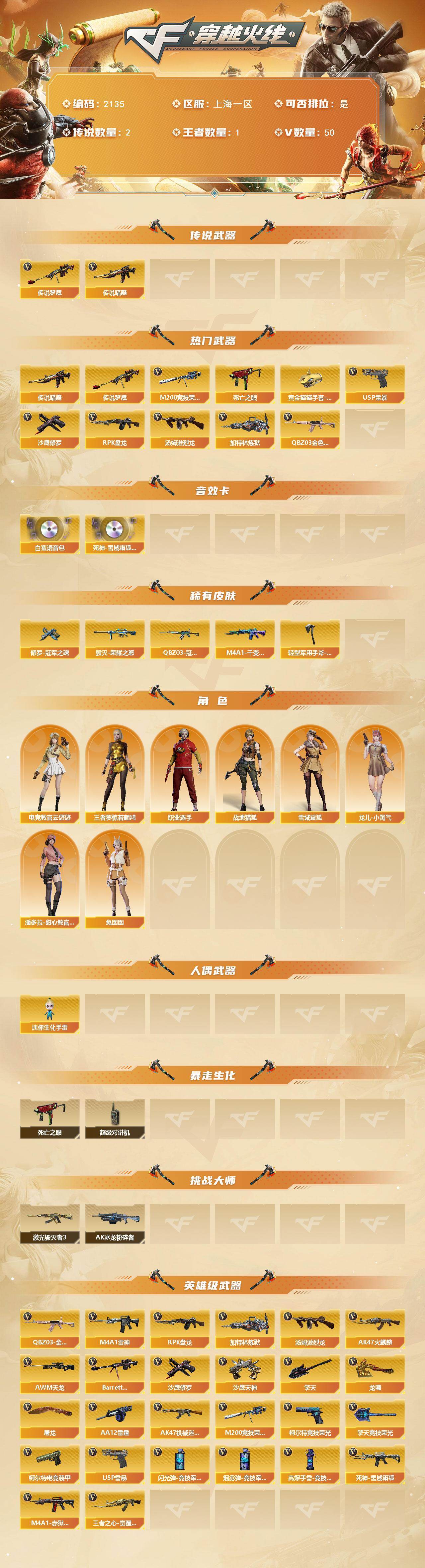 [16808495]上海一区-55V-1王者武器数-0炫金武器数 【传说武器】:传说暗裔,传说梦魇 【热门武器】:传说暗裔,传说梦魇,QBZ03-金色蔷薇,M200-竞技荣光,死亡之眼,汤姆逊-烈龙,RPK-盘龙*4,加特林-炼狱,USP-雷暴,沙鹰-修罗,黄金猫猫手套-白鲨 【音效卡】:白鲨语音包,死神-雪域霜狐-怀旧音效卡 【皮肤】:QBZ03-冠军之薇,毁灭-荣耀之怒,M4A1-千变-孔明皮肤,修罗-冠军之魂,轻型军用手斧-再燃火线 【角色】:电竞教官-云悠悠,战地猎狐,王者葵-惊若翩鸿,雪域霜狐,龙儿-小淘气,潘多拉-甜心教官,兔囡囡,职业选手 【人偶武器】:迷你生化手雷 【暴走生化】:死亡之眼,超级对讲机 【挑战大师】:AK47-冰龙粉碎者,激光毁灭者III 【英雄级武器】:AK47-火麒麟,M4A1-雷神,AK47-机械迷城,死神-雪域霜狐,QBZ03-金色蔷薇,王者之心-觉醒版,AWM-天龙,Barrett-毁灭,M200-竞技荣光,RPK-盘龙*4,加特林-炼狱,汤姆逊-烈龙,AA-12-雷霆,沙鹰-修罗,沙鹰-天神*2,USP-雷暴,柯尔特-电竞装甲,柯尔特-竞技荣光,屠龙,龙啸,擎天,擎天-竞技荣光,高爆手雷-竞技荣光*4,闪光弹-竞技荣光*4,烟雾弹-竞技荣光*4,M4A1-赤狱骑士 【道具】:CFS限定背包,Q9战队炫彩背包,炫彩背包,背包-洛丽塔,雪域霜狐炫彩背包,女皇终结者-魔龙之吻,救世主-黑桃战神,黄金生化钩,绿色巨人,灵魂忍者,迷雾幽灵,夺命之镰,防化服*3,语音特效-怀旧,雪域霜狐表情,动感闪耀表情,防弹头盔*6,防弹衣*6,C4工具钳*6,手雷包*6 【特殊枪械】:1烈龙,4盘龙,1炼狱
