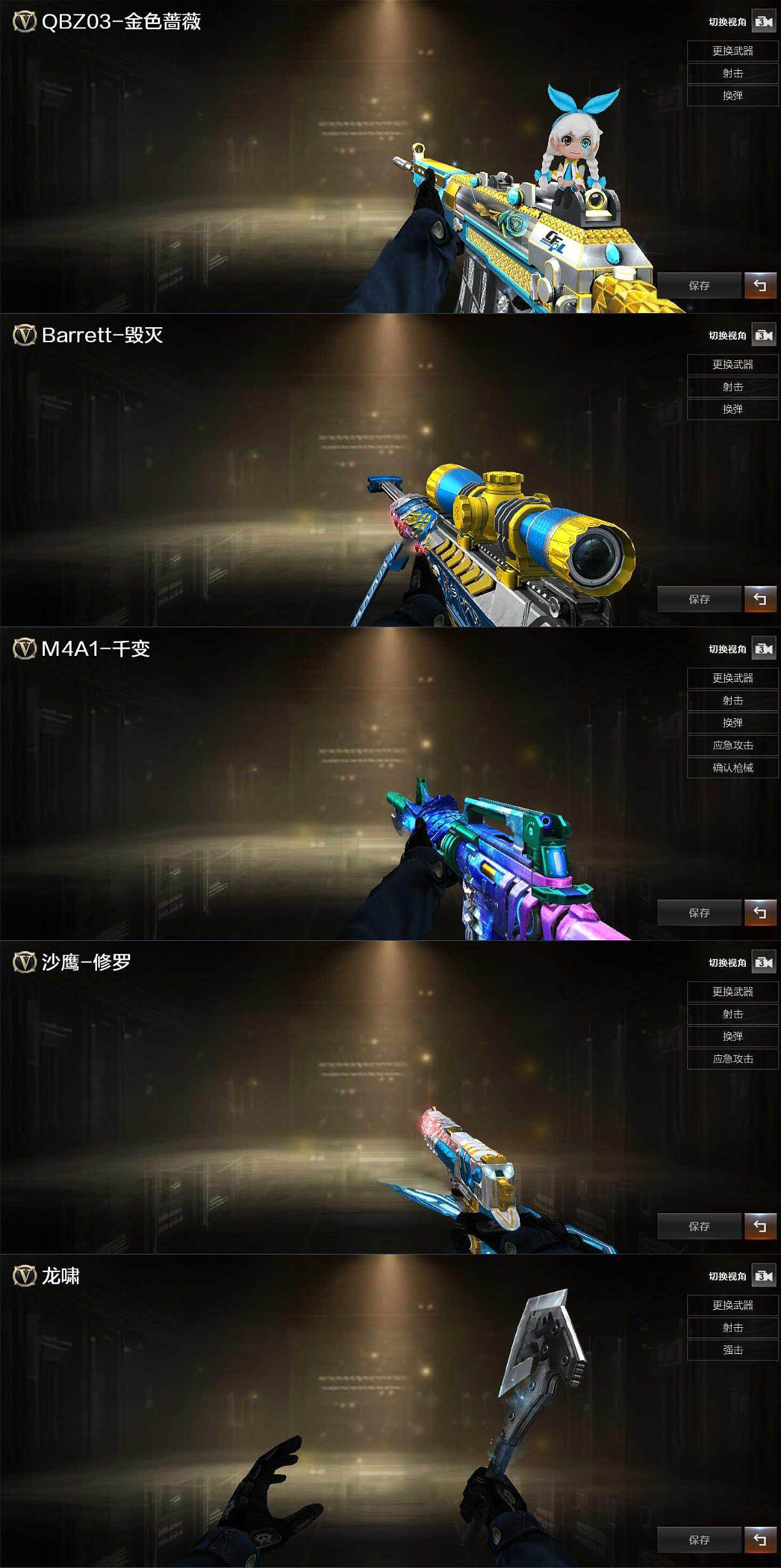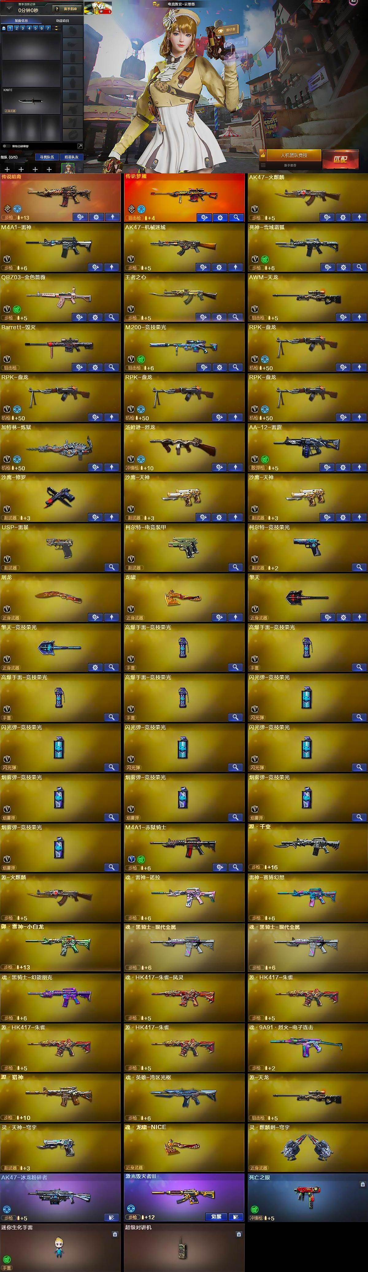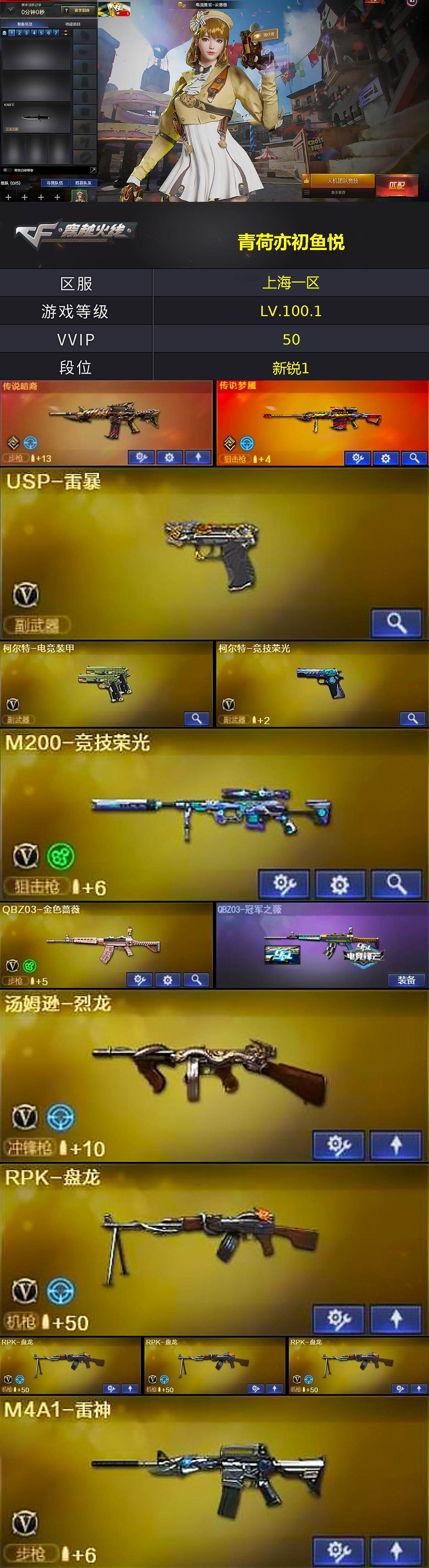 【热门武器】:传说暗裔,传说梦魇,QBZ03-金色蔷薇,M200-竞技荣光,死亡之眼,汤姆逊-烈龙,RPK-盘龙*4,加特林-炼狱,USP-雷暴,沙鹰-修罗,黄金猫猫手套-白鲨