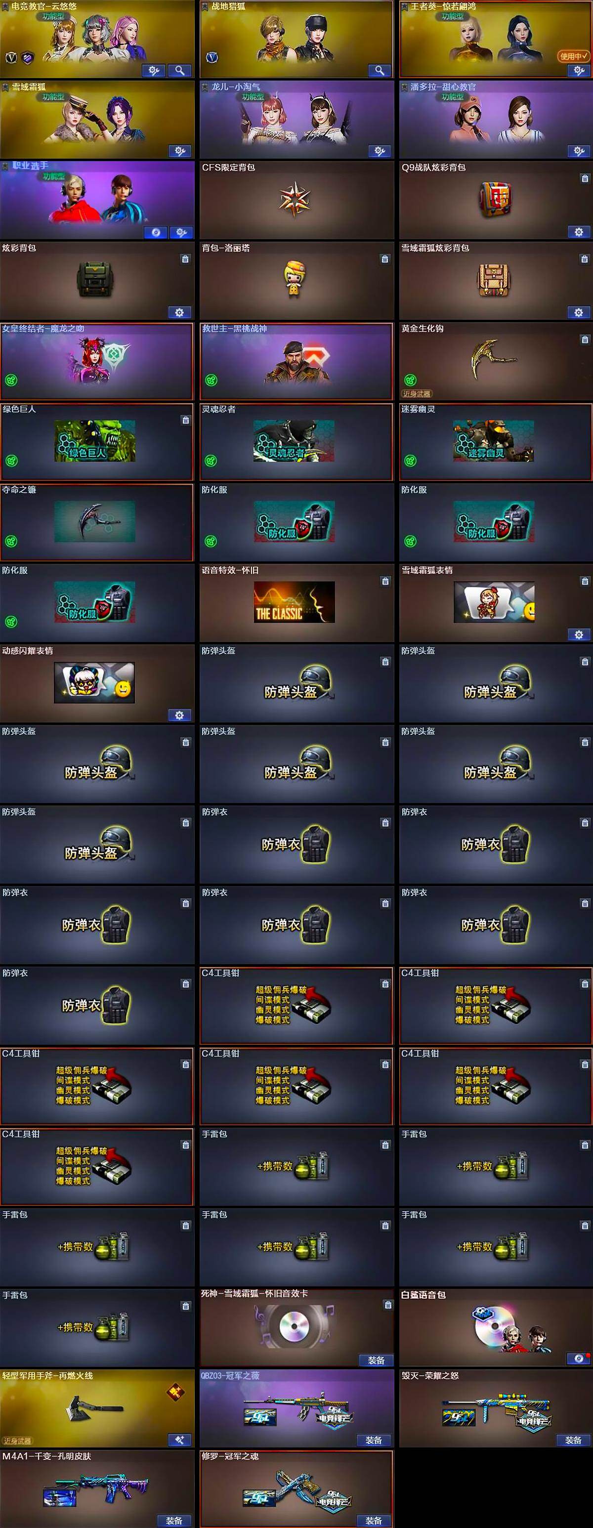 【道具】:CFS限定背包,Q9战队炫彩背包,炫彩背包,背包-洛丽塔,雪域霜狐炫彩背包,女皇终结者-魔龙之吻,救世主-黑桃战神,黄金生化钩,绿色巨人,灵魂忍者,迷雾幽灵,夺命之镰,防化服*3,语音特效-怀旧,雪域霜狐表情,动感闪耀表情,防弹头盔*6,防弹衣*6,C4工具钳*6,手雷包*6