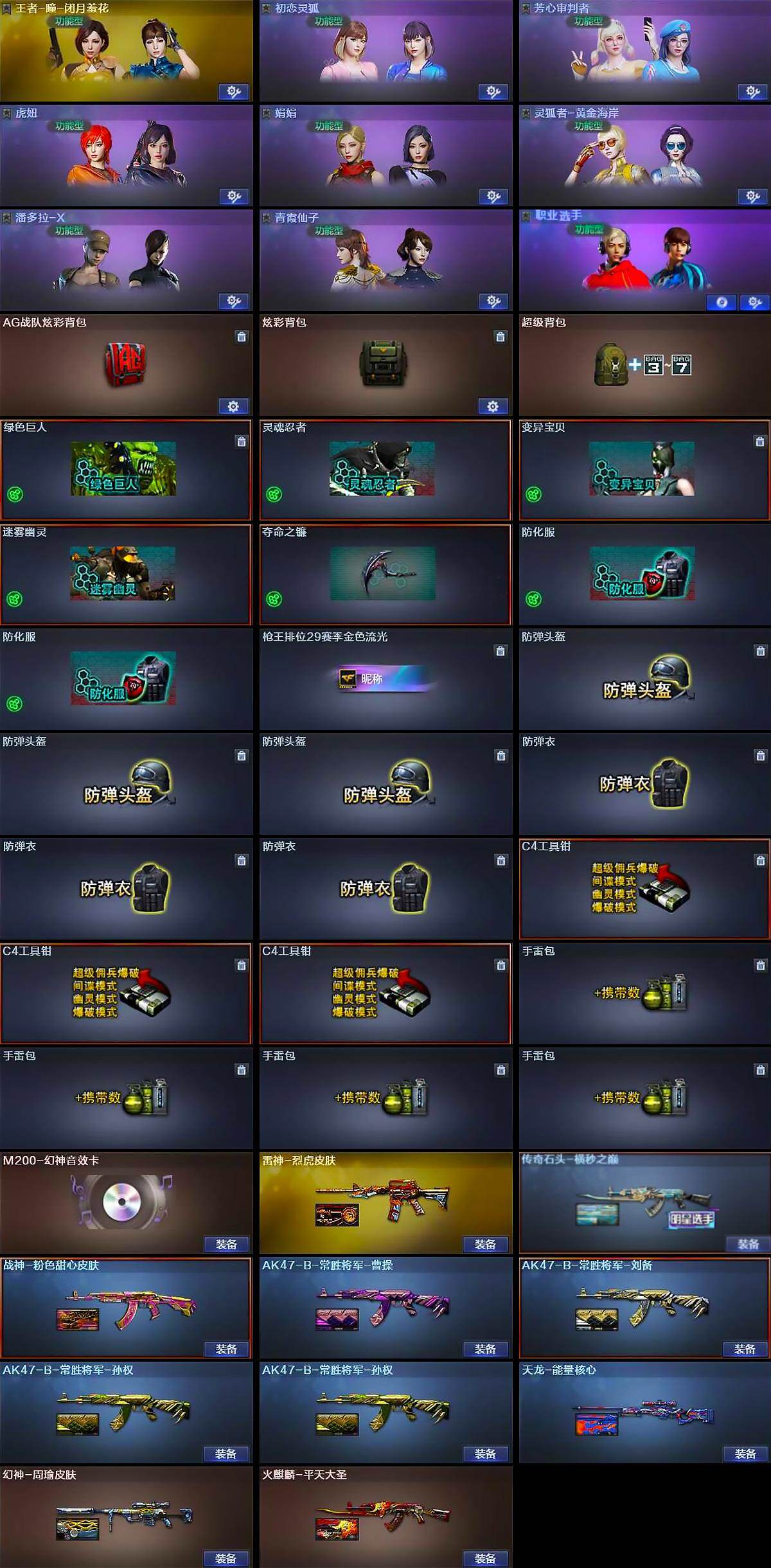 【道具】:AG战队炫彩背包,炫彩背包,超级背包,绿色巨人,灵魂忍者,变异宝贝,迷雾幽灵,夺命之镰,防化服*2,枪王排位29赛季金色流光,防弹头盔*3,防弹衣*3,C4工具钳*3,手雷包*4